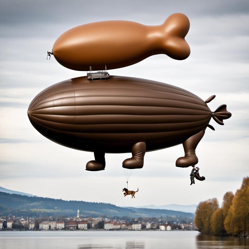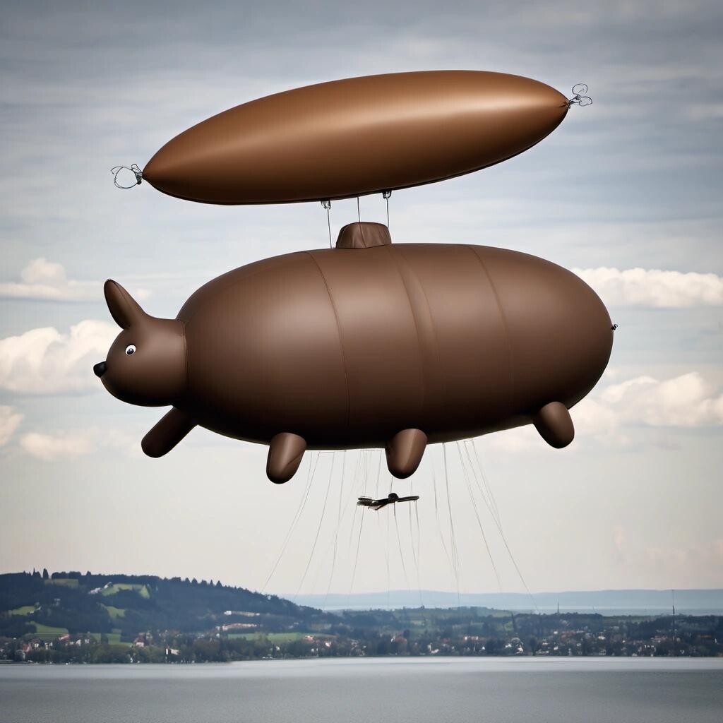 nostr:npub1p5qe4mtwxascahtp6szght2nlp06gwwwwllq7e7g6308p4y9dvys8nw2sf draw for me a brown dog shaped like a blimp, hovering above lake Constance. As style, please usw a high definition photograph