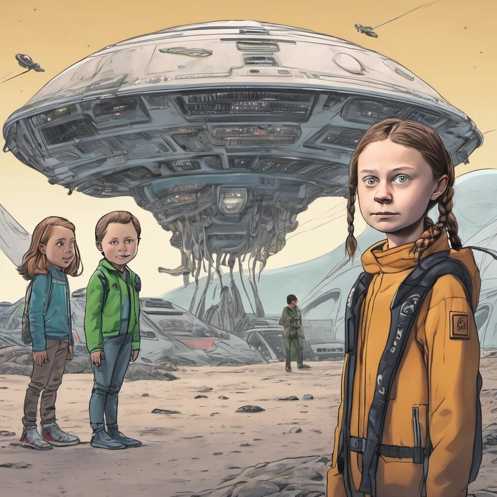 Prompt: Greta Thunberg meets the alien ambassador, alien starship in the background