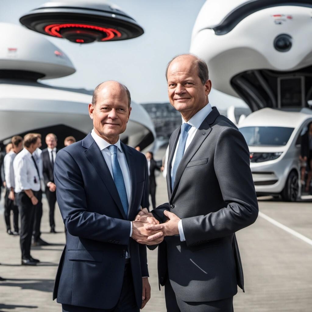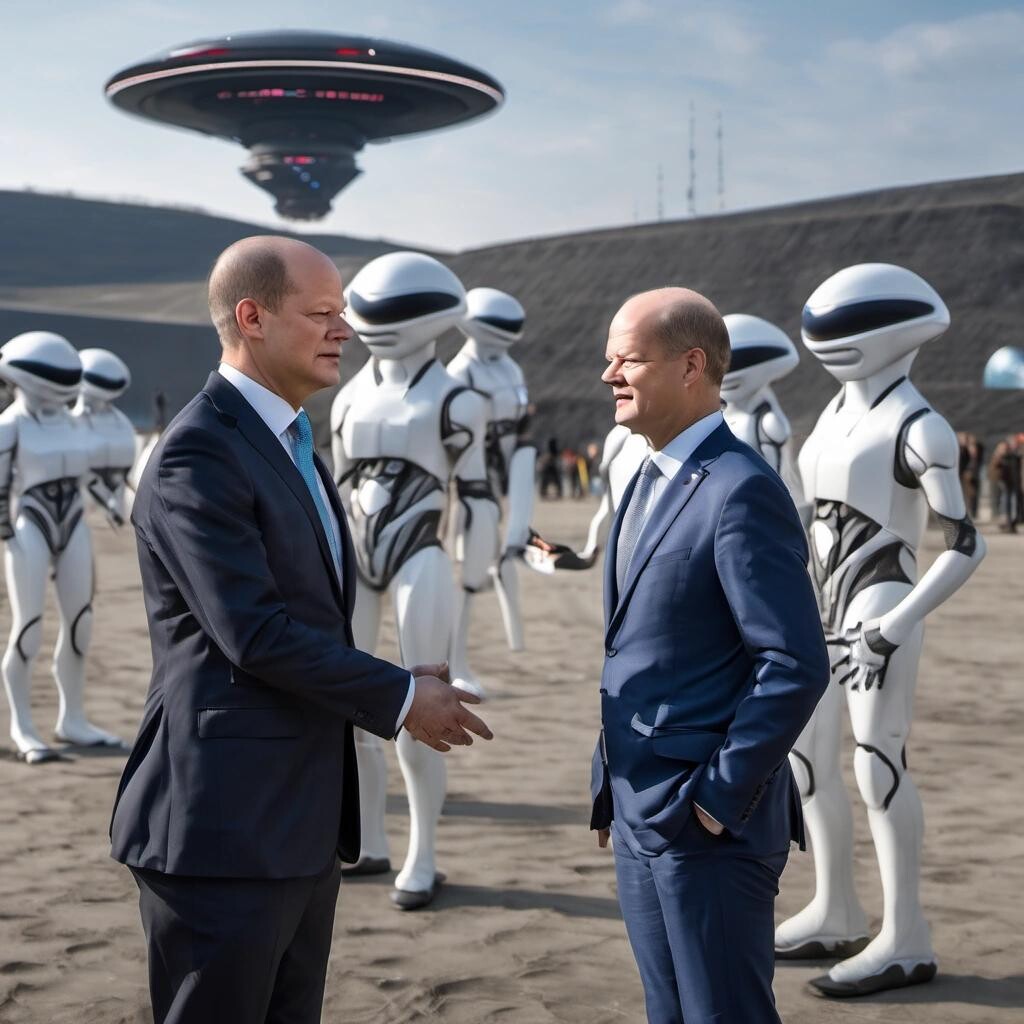 Prompt: Olaf Scholz meets the alien ambassador, alien starship in the background