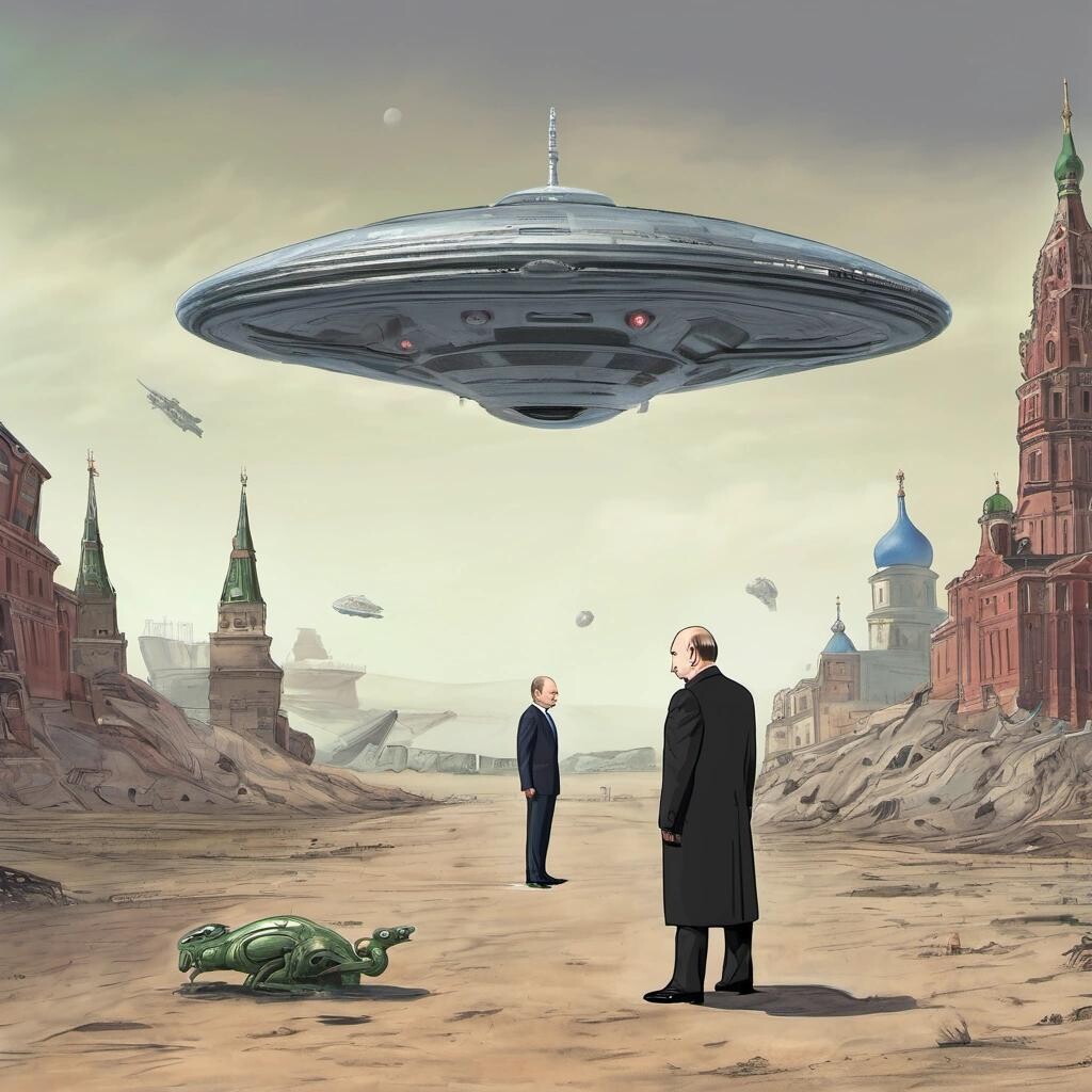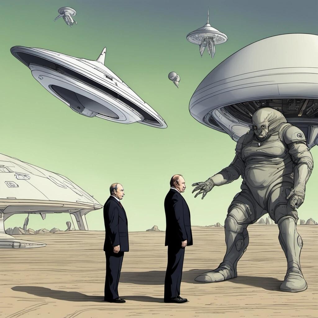 Prompt: Vladimir Putin meets the alien ambassador, alien starship in the background
