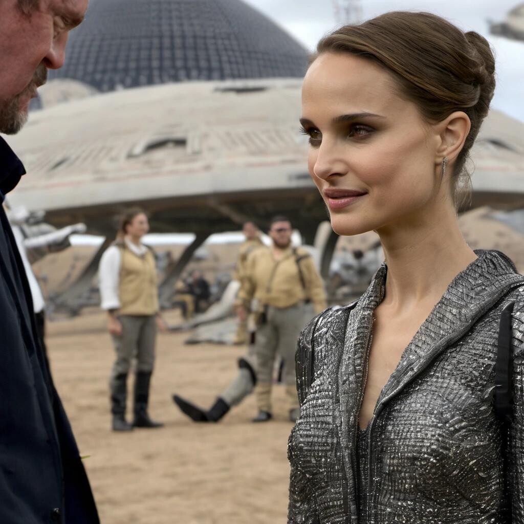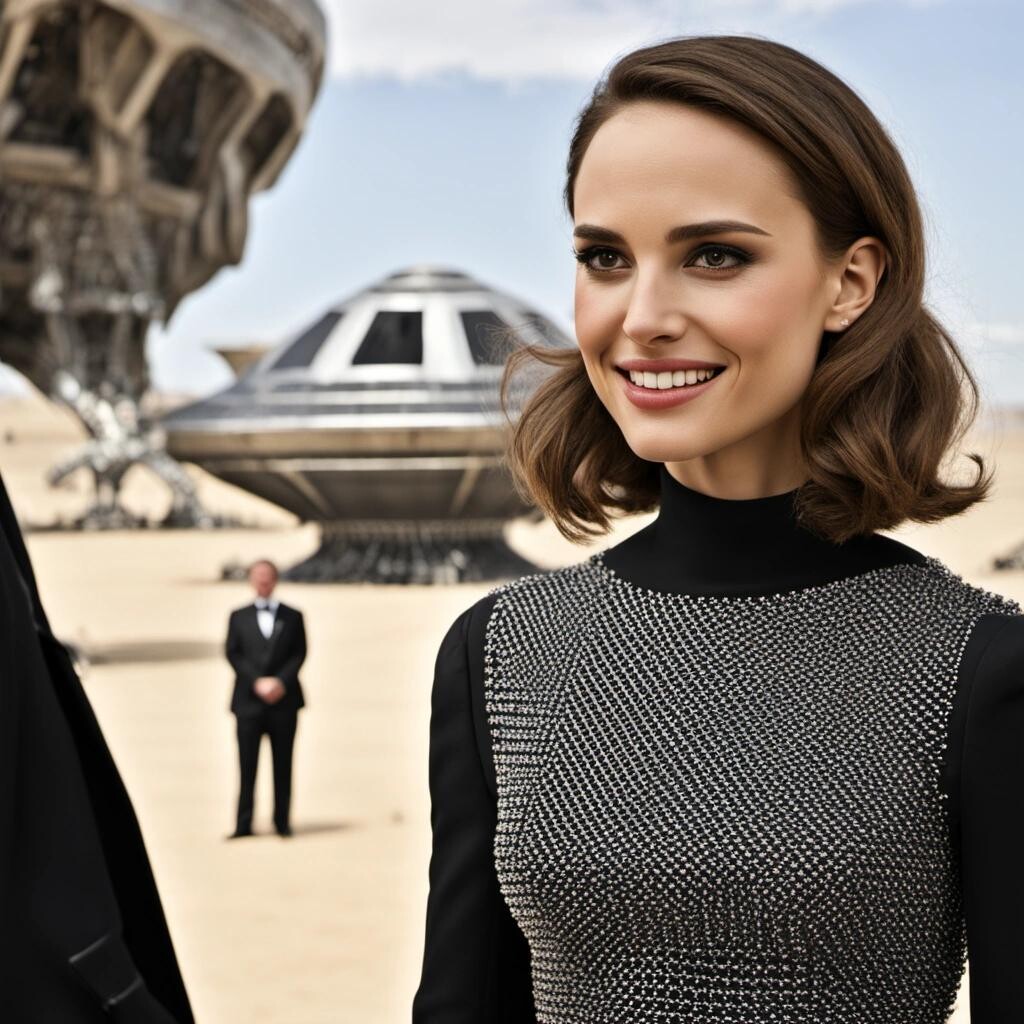 Prompt: Natalie Portman meets the alien ambassador, alien starship in the background
