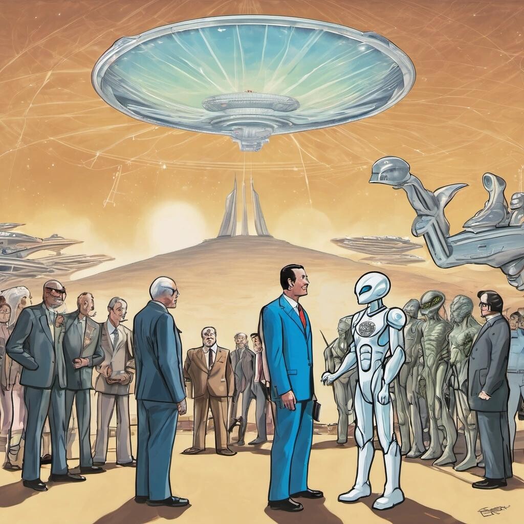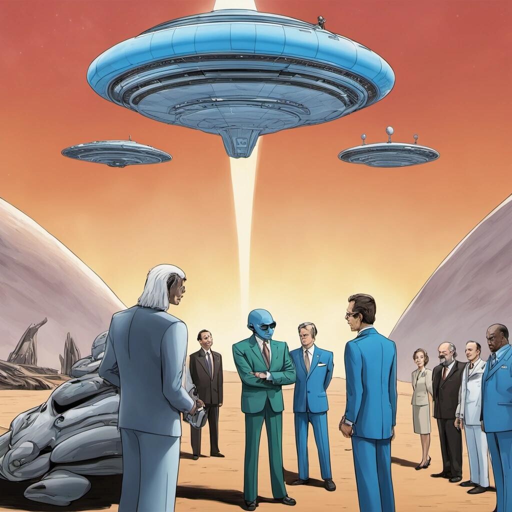 Prompt: Representatives of the United Nations meet the alien ambassador, alien starship in the background