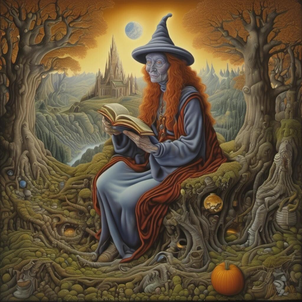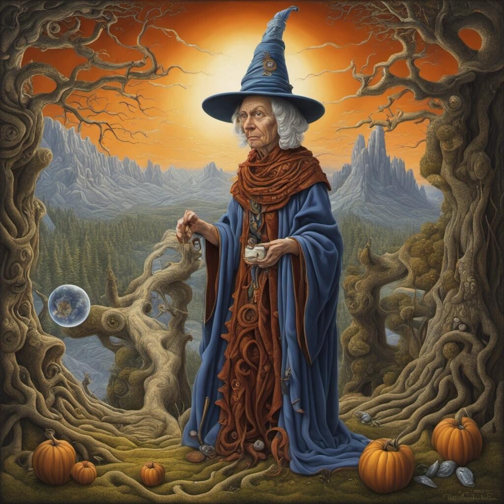 Prompt: The Wise Witch, Hulda Brimm of Oldwynton, fantasy, intricate, oil on canvas, Jacek Yerka, Alex Grey, Thomas Hart Benton