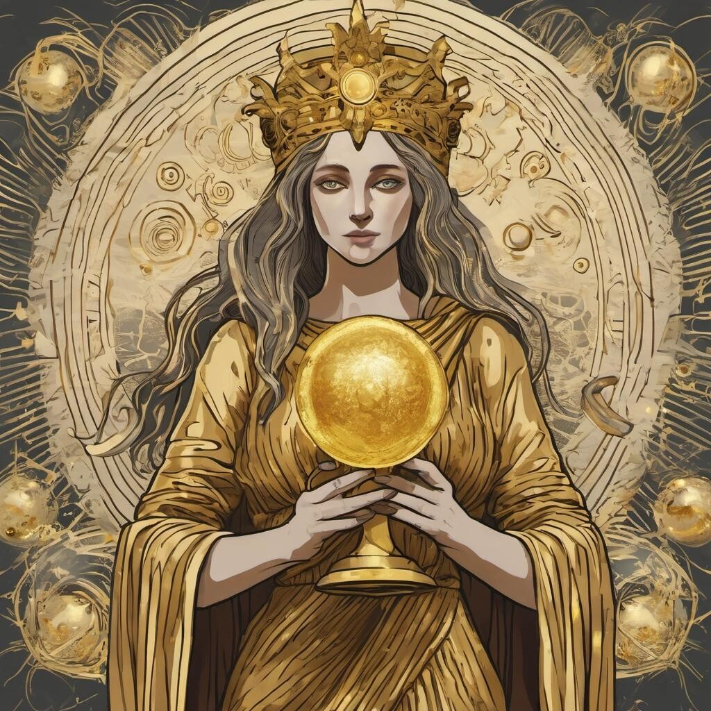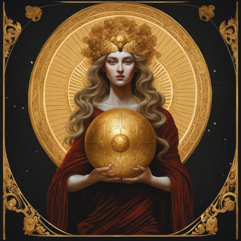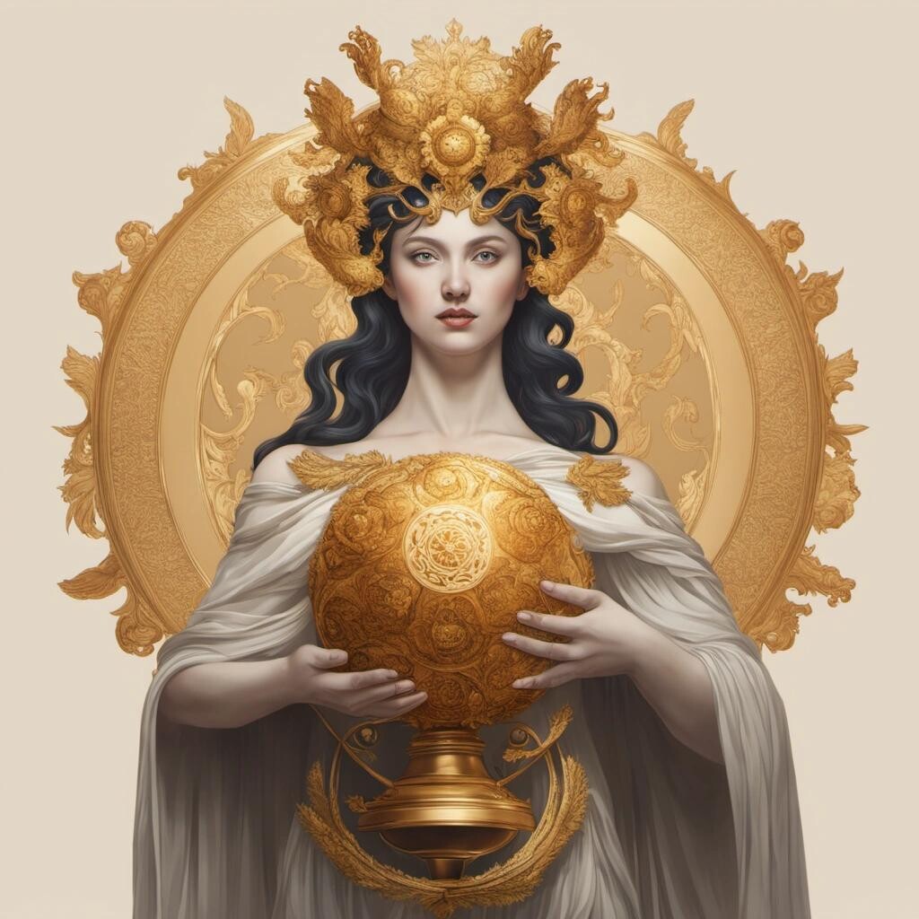 Prompt: The Goddess Eris holding a golden coronavirus