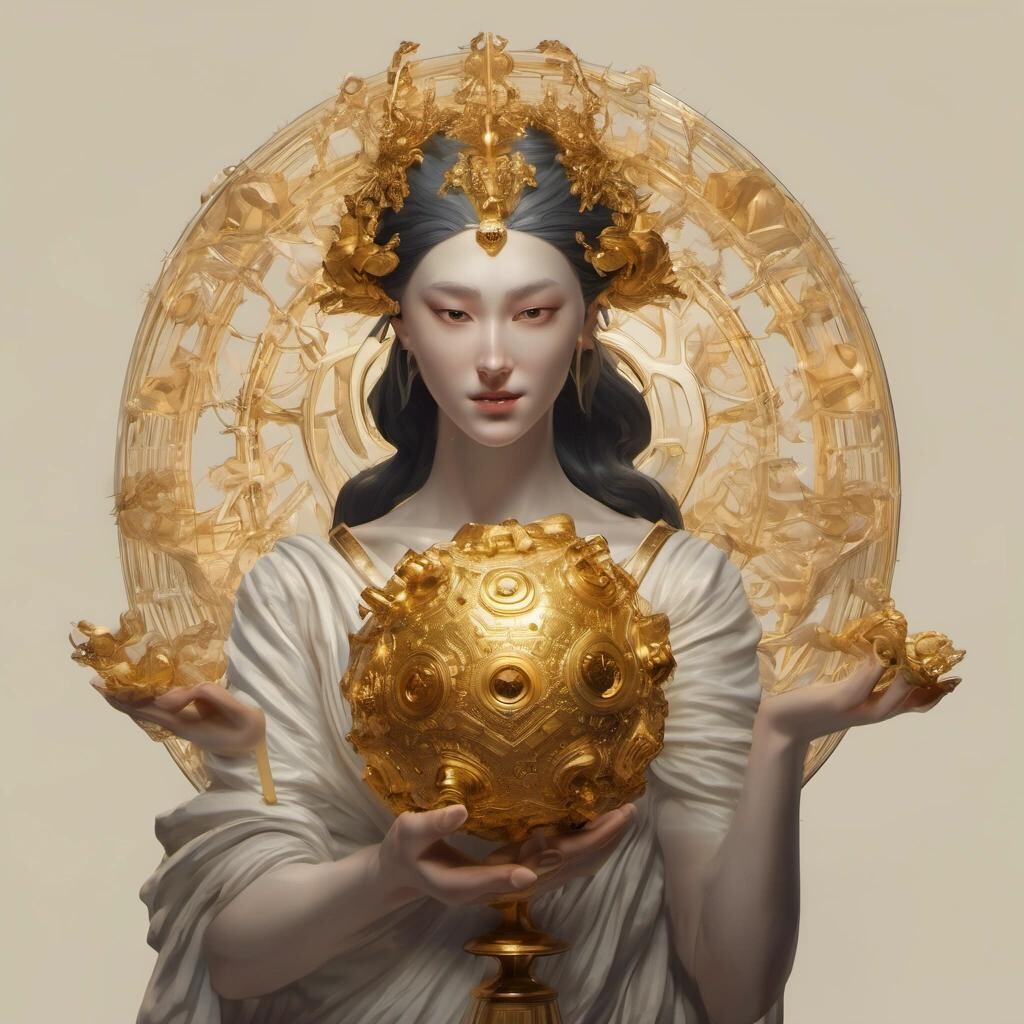 Prompt: a giant coronavirus made from pure gold in the hand of the goddess eris