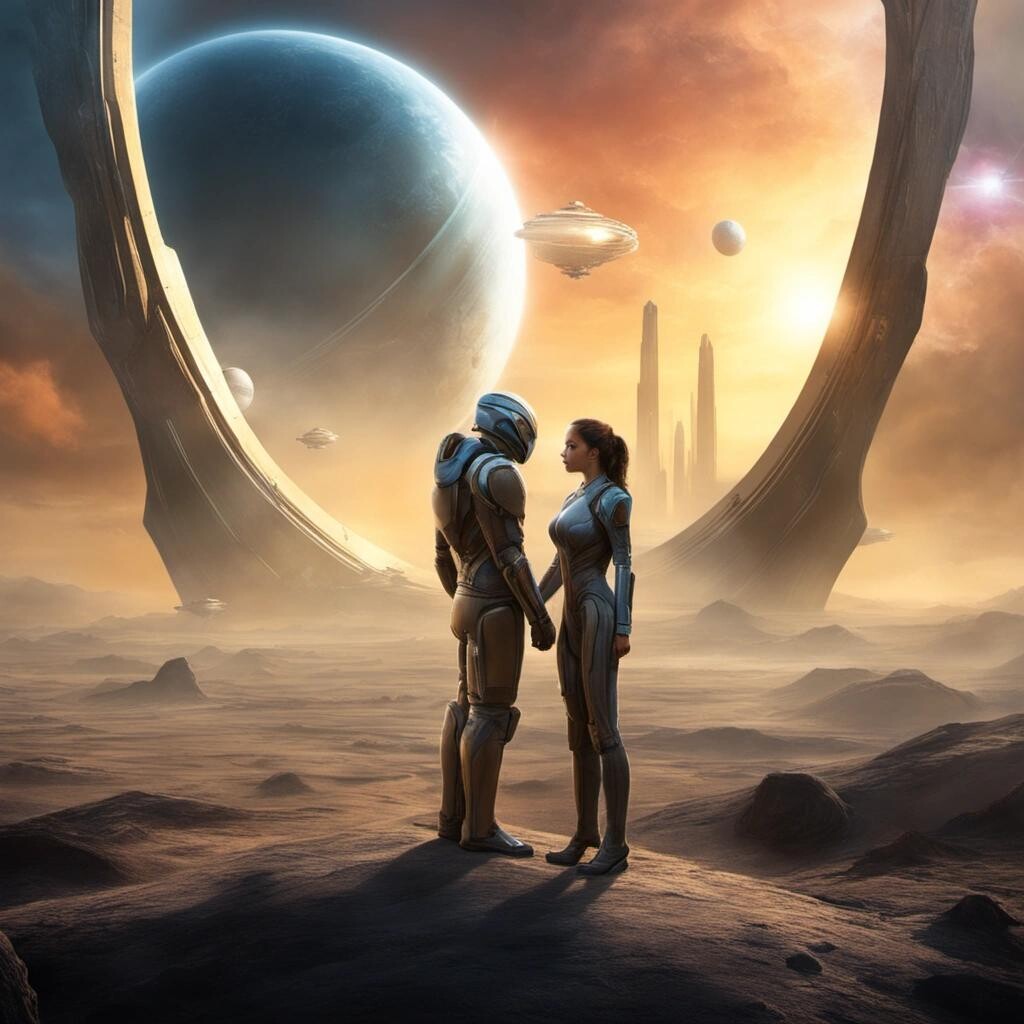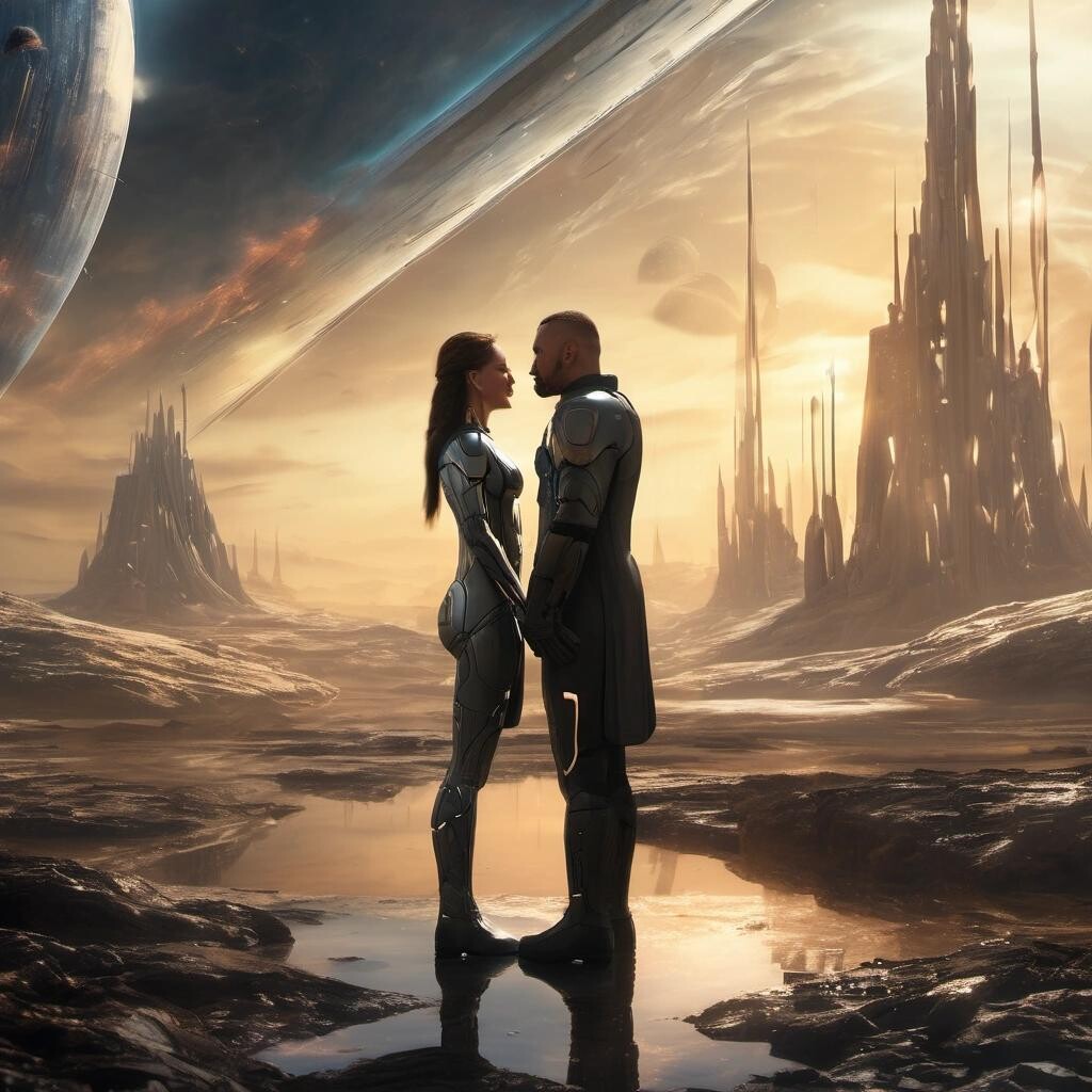 Prompt: 23rd Century Love Story. Fantastic art award winner. Science-fiction cinematic masterpiece. dof , 8k , oil on canvas, cinematic lighting, poster, fantastic view, high definition, hdr, cinematic postprocessing, focused Oil on panel,