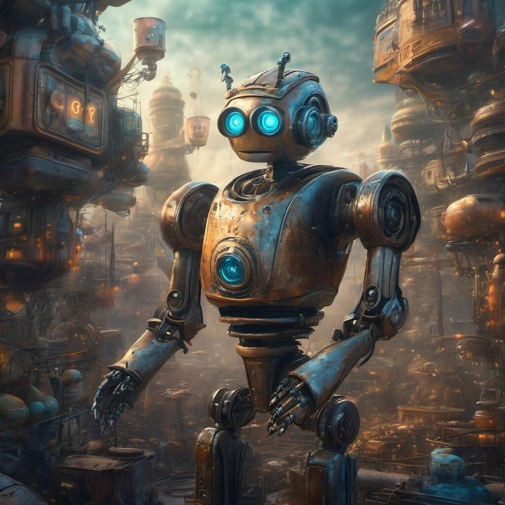 Prompt: Robot Fairytales. Fantastic art award winner. Science-fiction cinematic masterpiece. dof , 8k , oil on canvas, cinematic lighting, poster, fantastic view, high definition, hdr, cinematic postprocessing, focused Oil on panel,