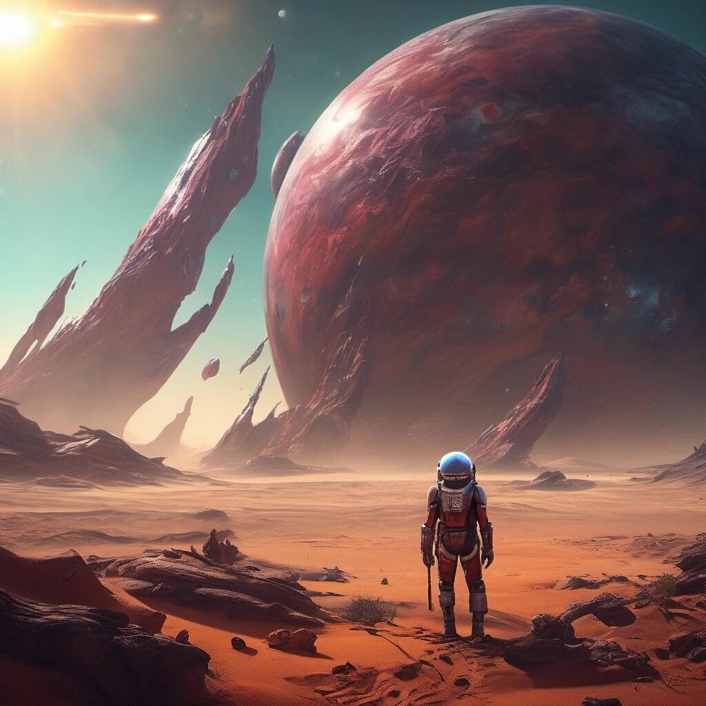 Prompt: Marooned on the savage planet. Fantastic art award winner. Science-fiction cinematic masterpiece. dof , 8k , oil on canvas, cinematic lighting, poster, fantastic view, high definition, hdr, cinematic postprocessing, focused Oil on panel,