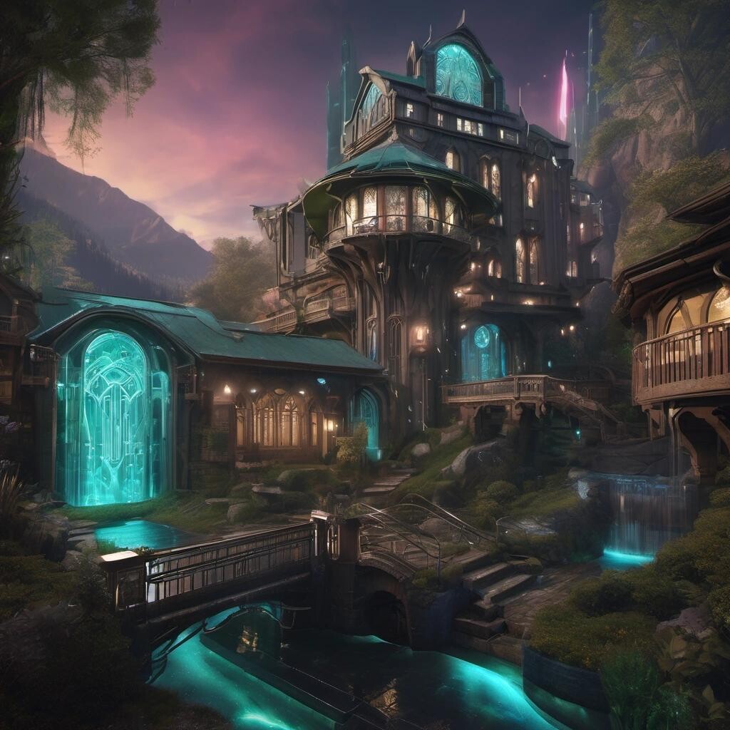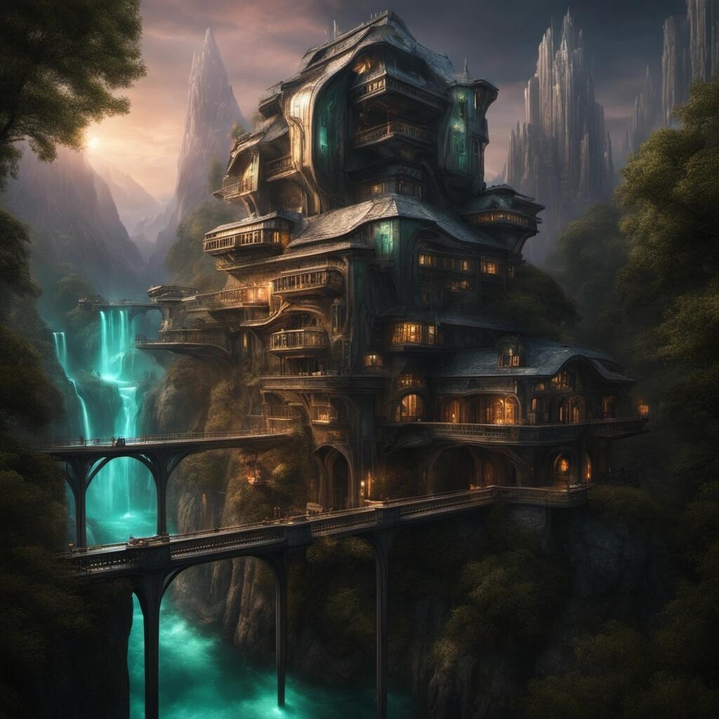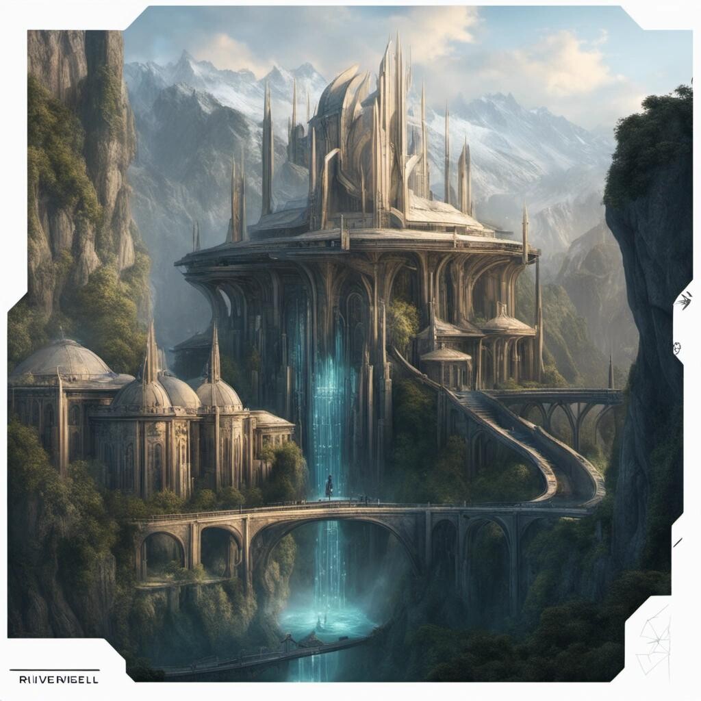 Prompt: cyberpunk Rivendell, realtors photos