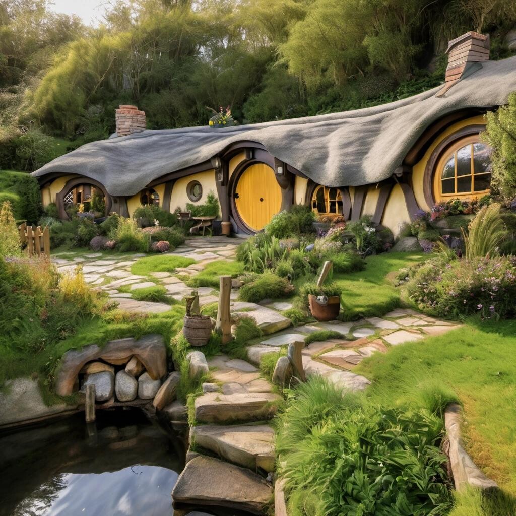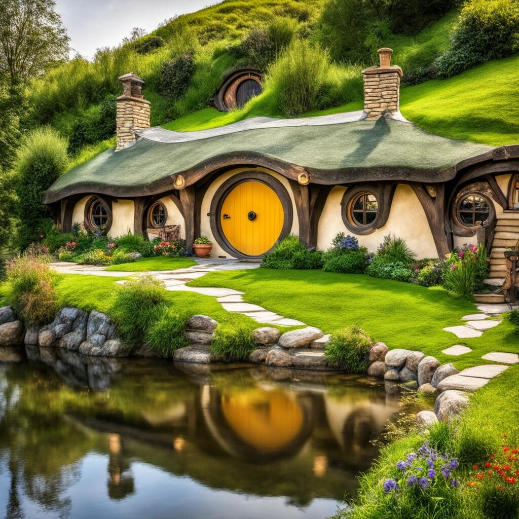 Prompt: a nice hobbit style home in the shire near the water