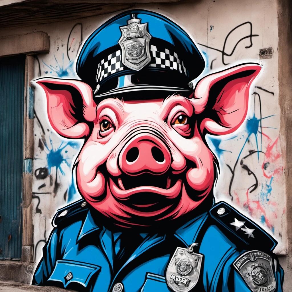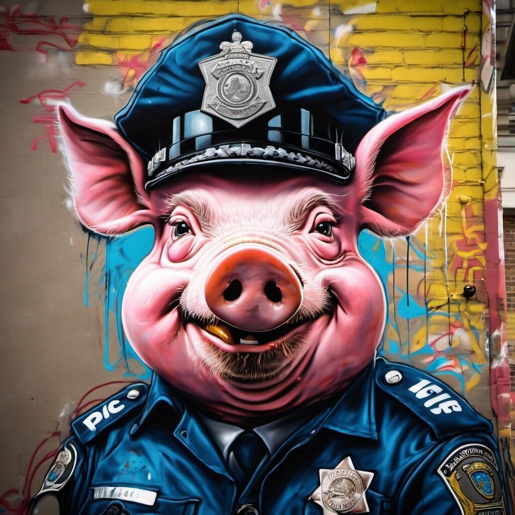 Prompt: Graffiti of an angry anthropomorphic pig in a police uniform
