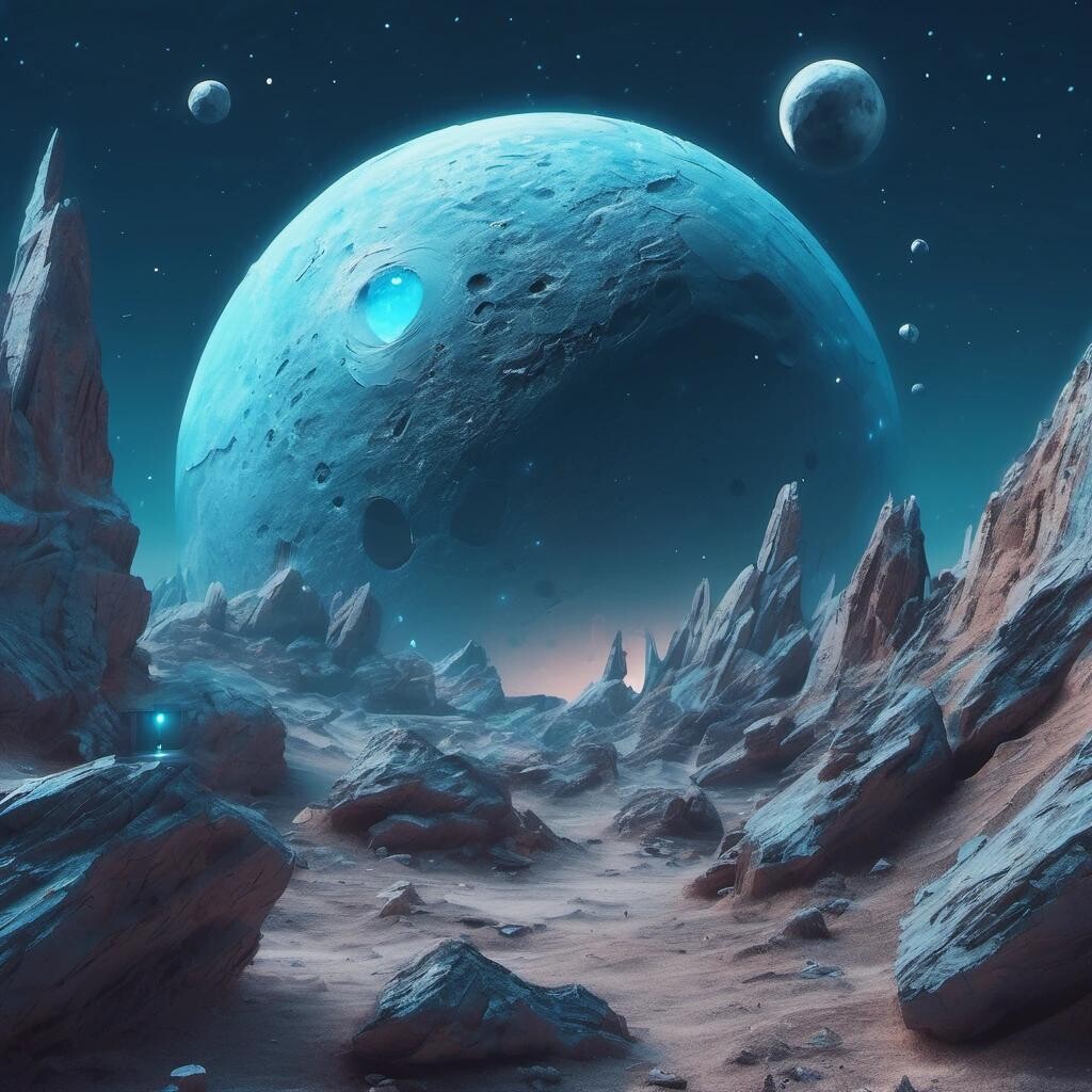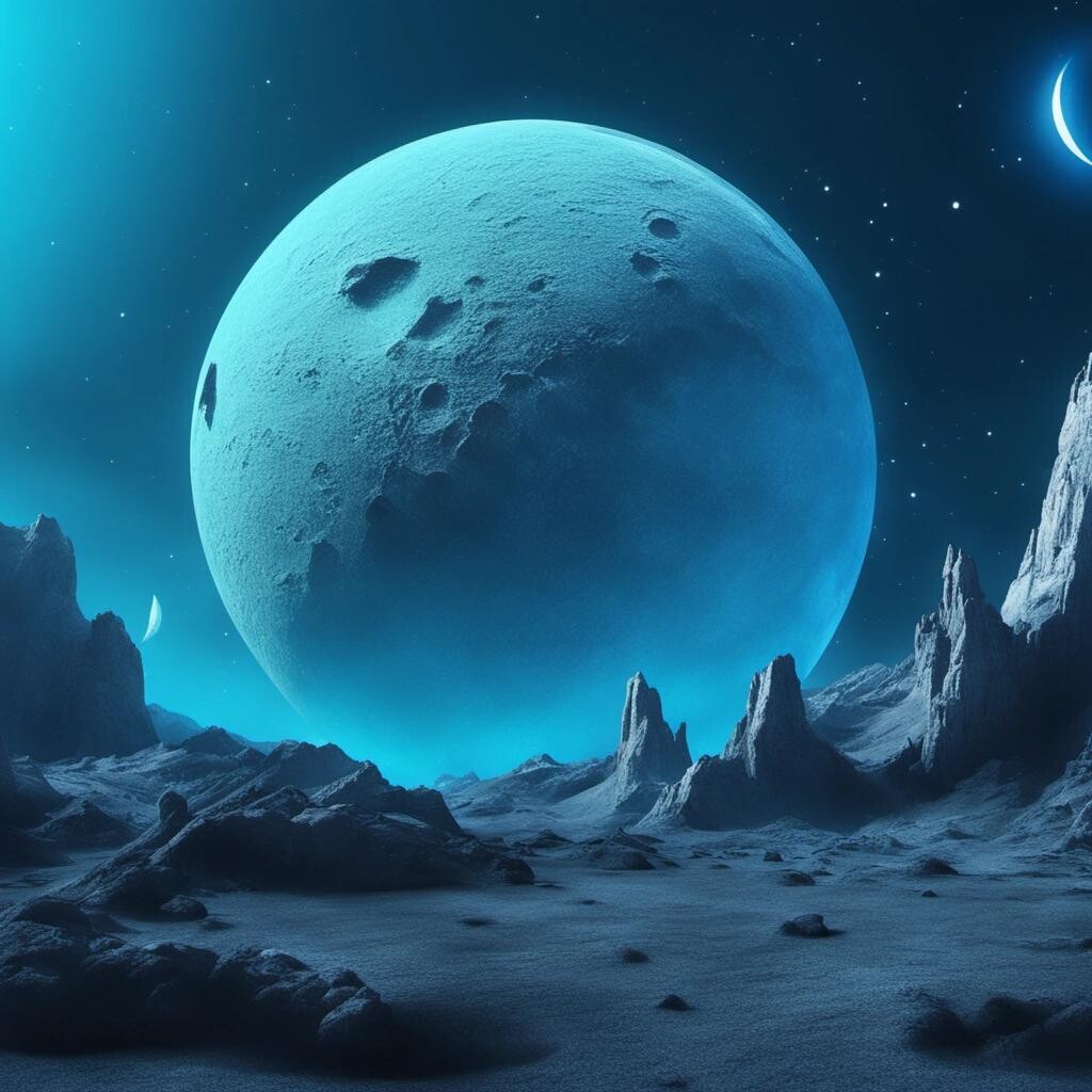Prompt: a futuristic background for a TikTok video with a big mineral blue moon in the upper part. Add some spacecraft around.