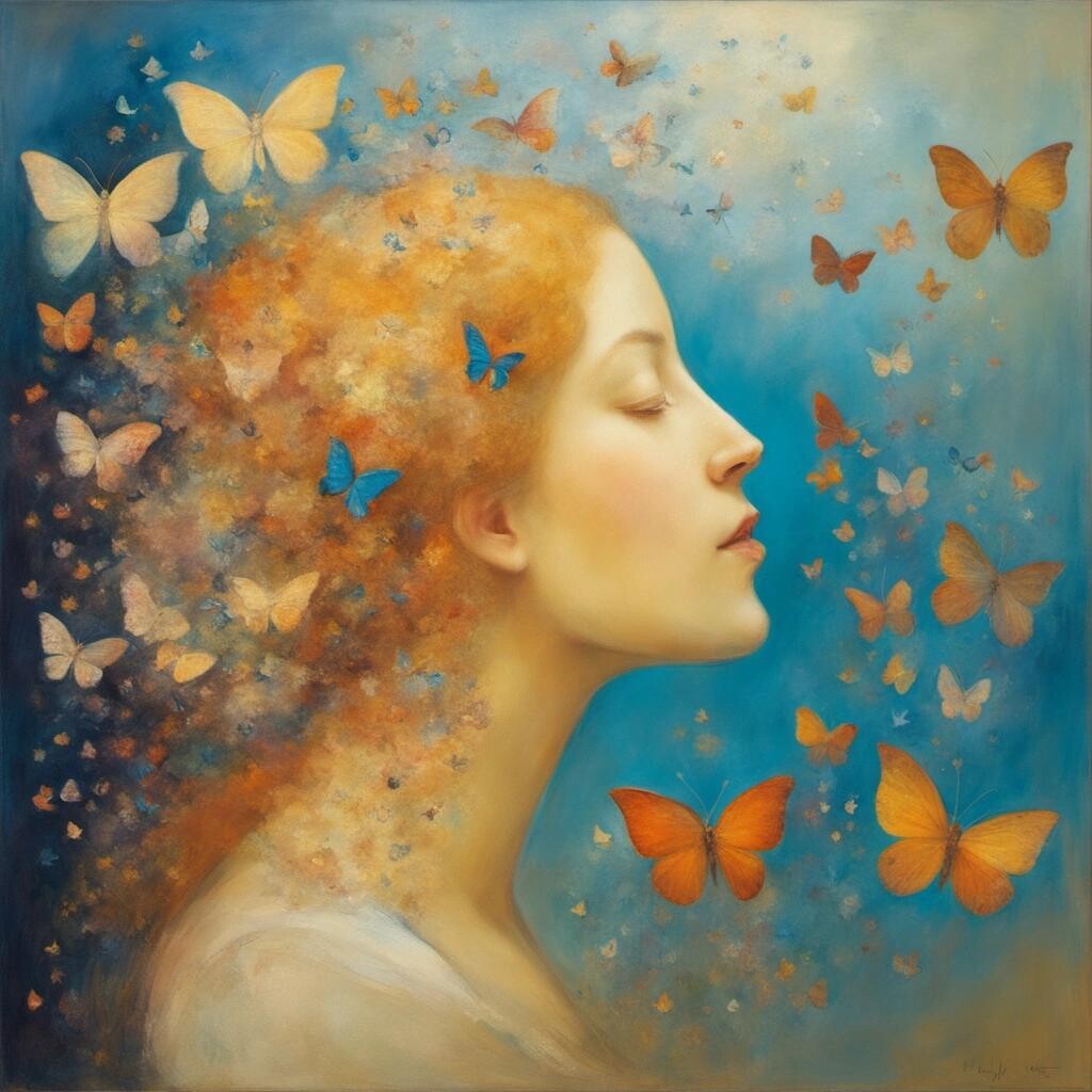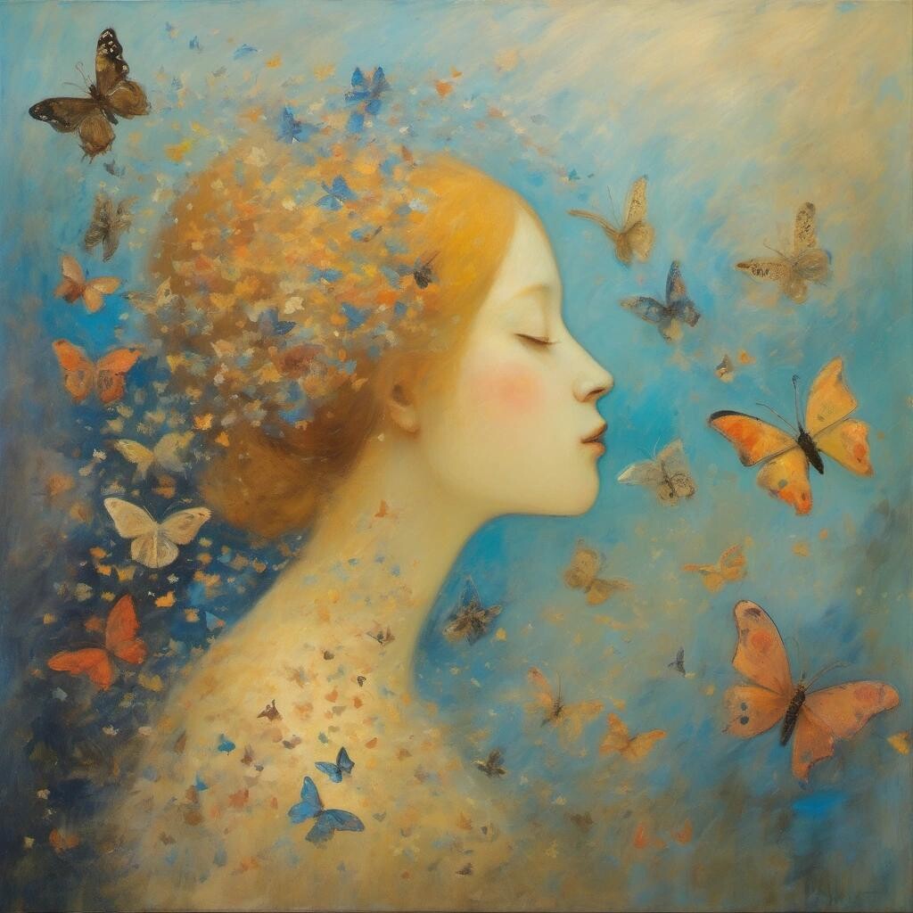 Prompt: A whimsical, dreamlike painting in the style of of Odilon Redon, featuring a gentle figure being kissed by a swarm of delicate butterflies