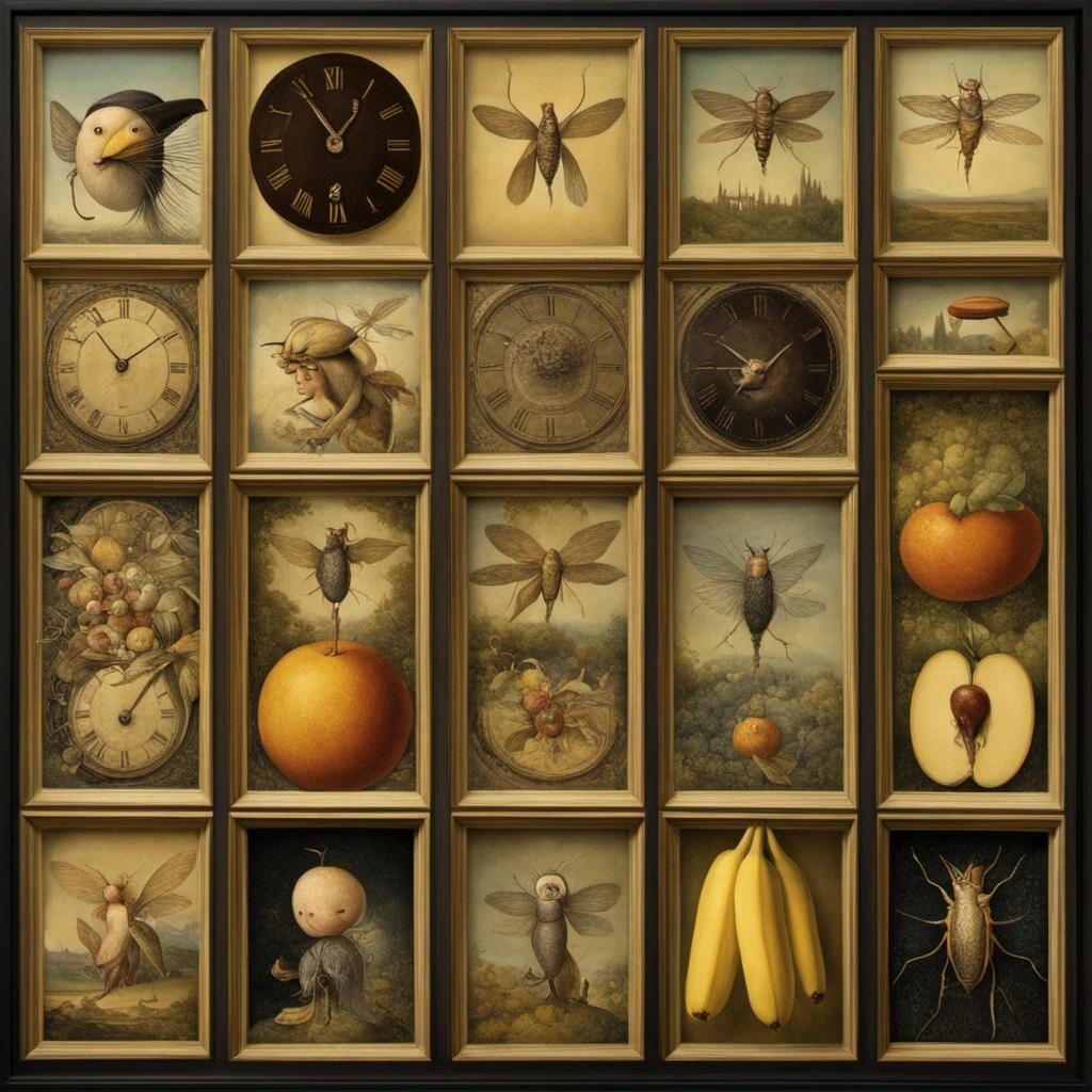 Prompt: Time flies like an arrow. Fruit flies like a banana. by Hieronymous Bosch, Naoto Hattori, Caspar David Friedrich, Aubrey Beardsley, Justin O'Neal, Daniel Merriam, Leonora Carrington, Ernst Haecke