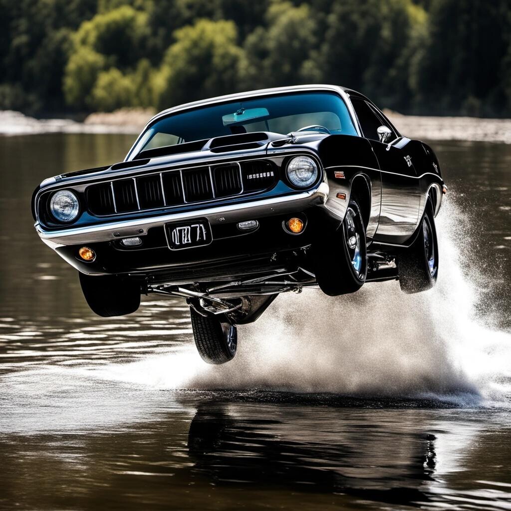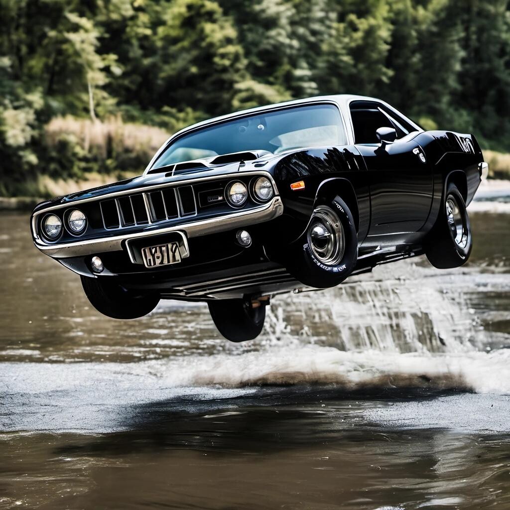 Prompt: a black 1971 Plymouth Hemi Cuda flying over a river