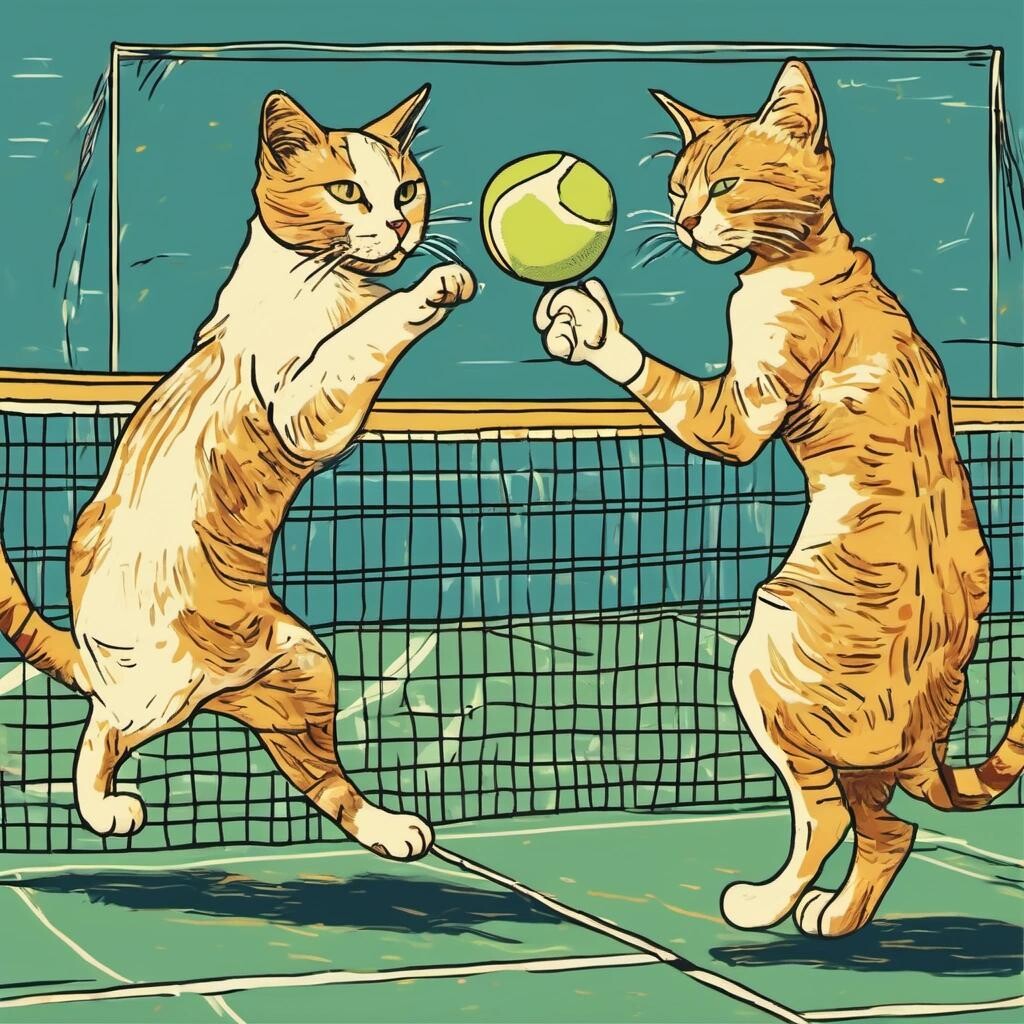 Prompt: a picture of two cats playing tennis in the style of Van Gogh