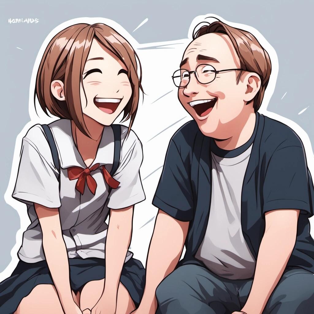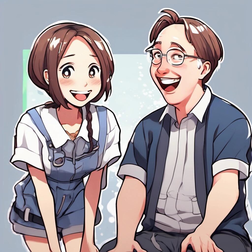 Prompt: a picture of a cute girl laughing with Linus Torvalds in the style of an anime