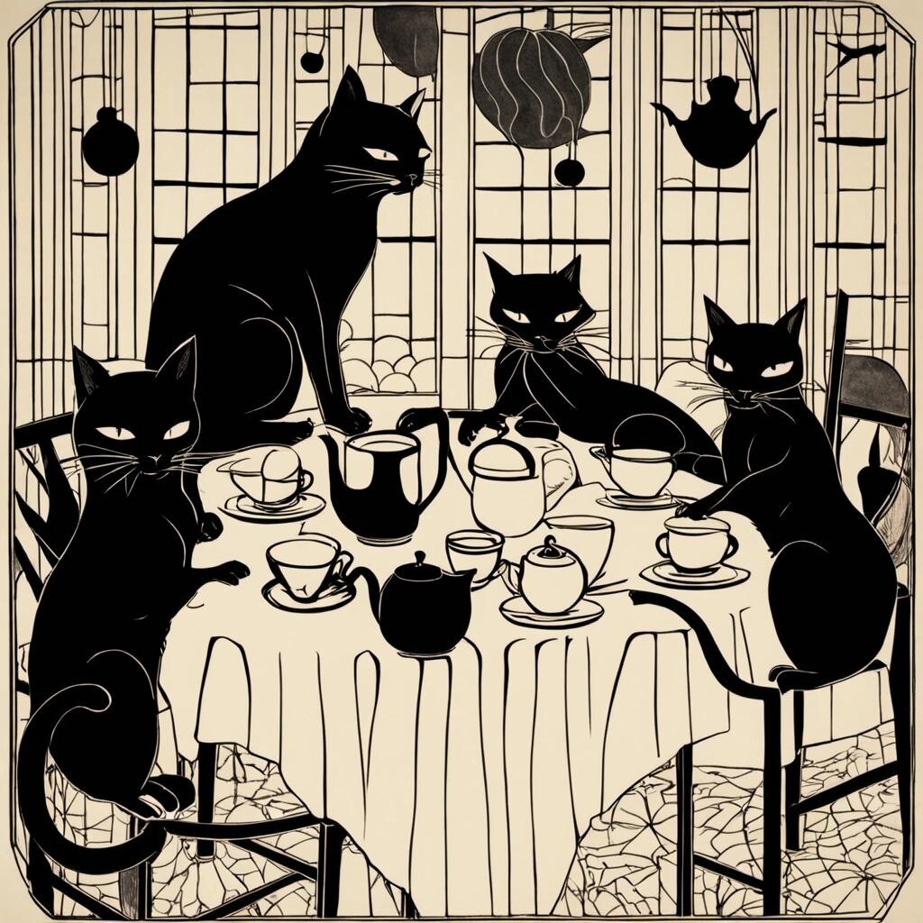 Prompt: a 1920 halloween tea party in the willow tea room glasgow with black cats, art deco, Charles Rennie Mackintosh