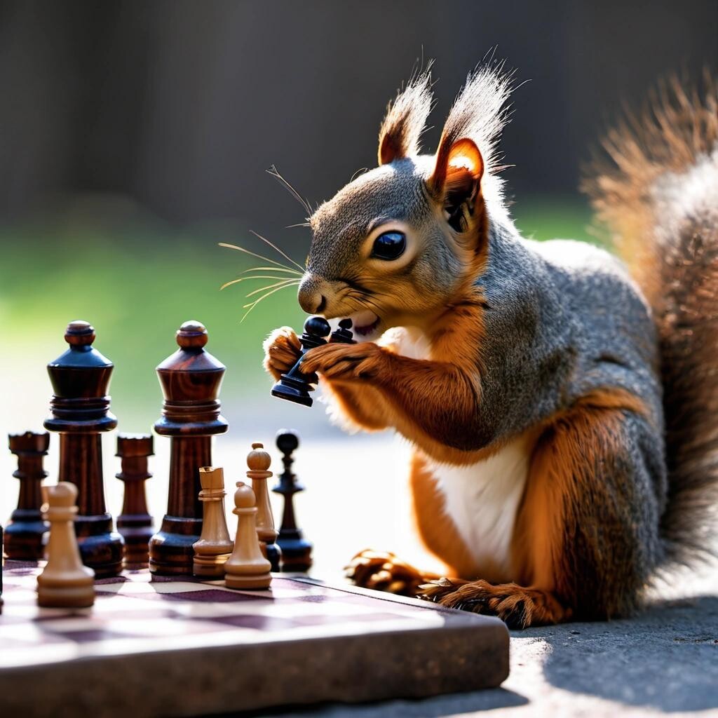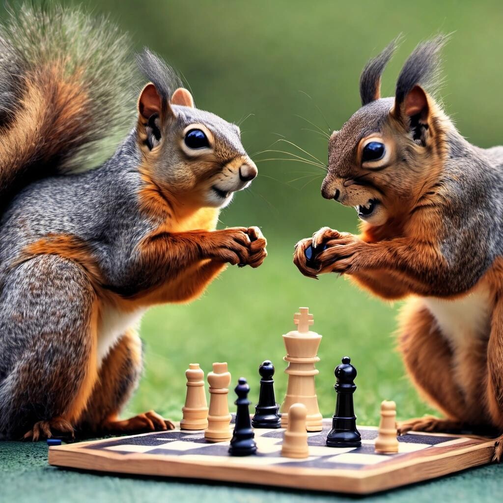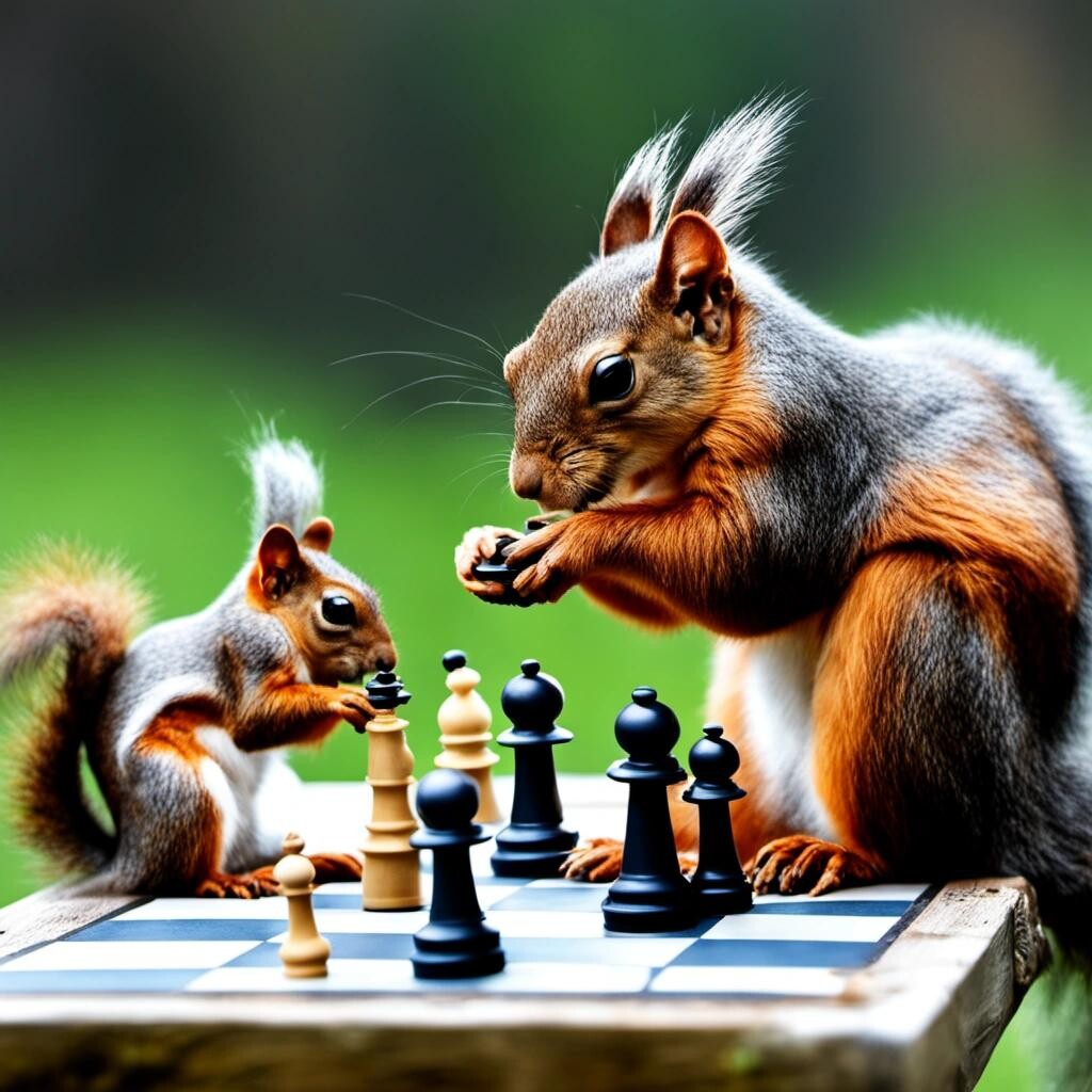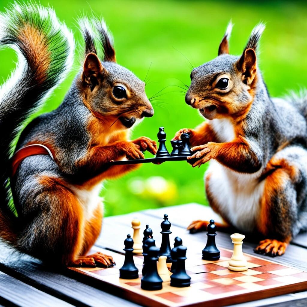 Prompt: a cute squirrel winning a game of Chess against stephen hawking