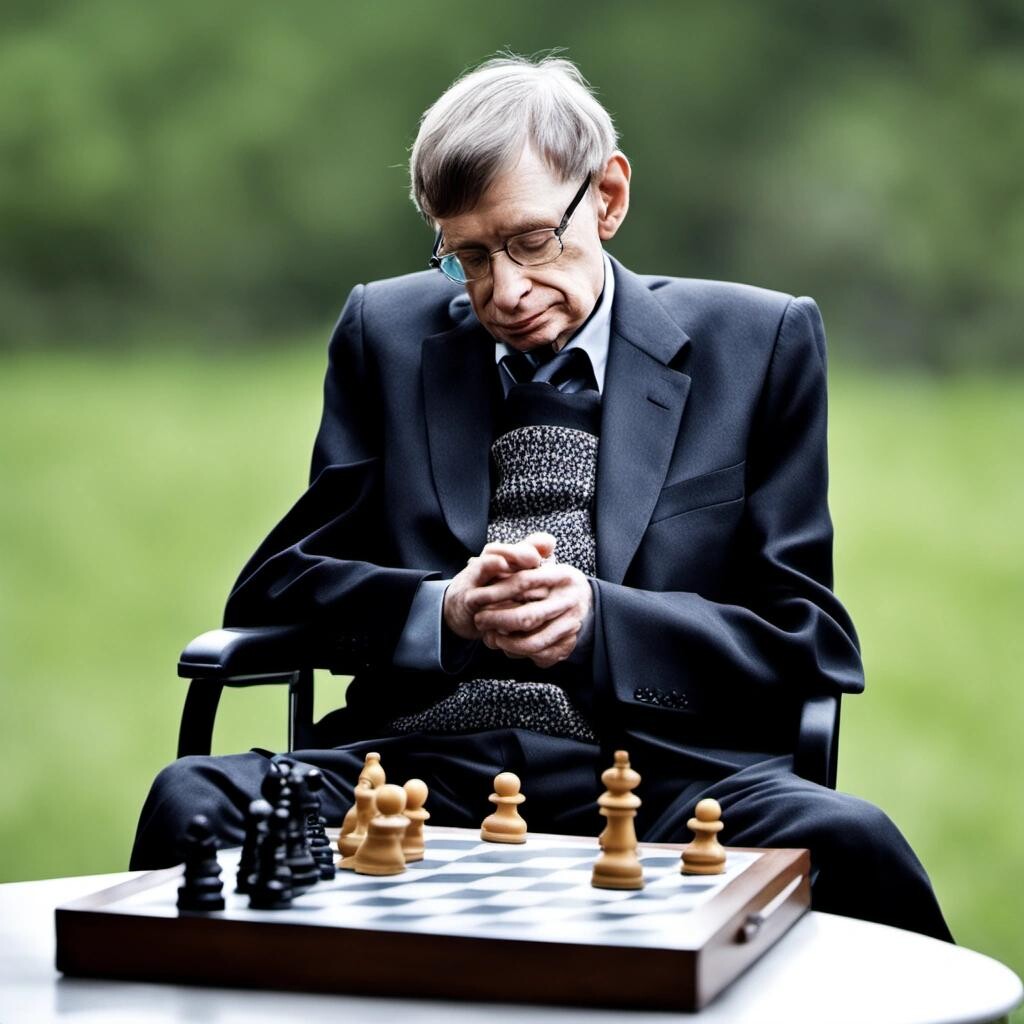 Prompt: Stephen Hawking playing a game of chess. The opponent is a cute squirrel.