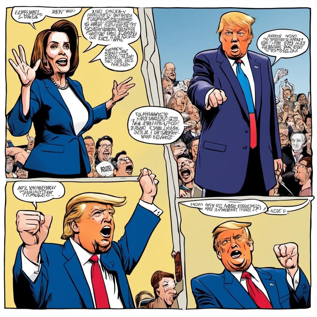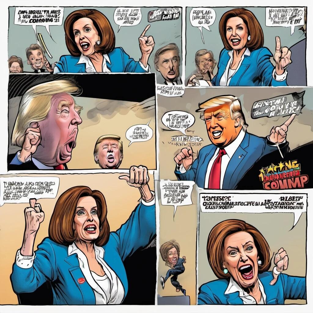 Prompt: Nancy Pelosi kicking Donald Trump in the teeth in the style of a comic book