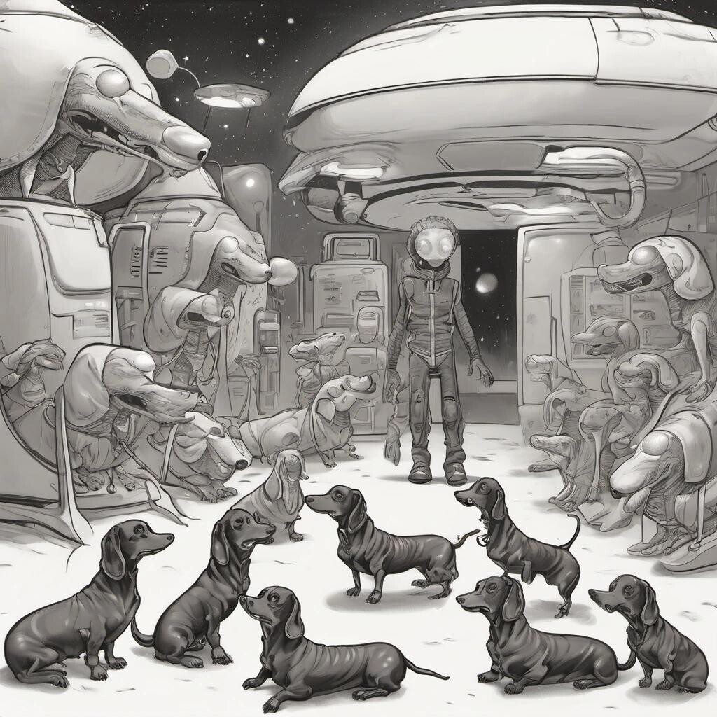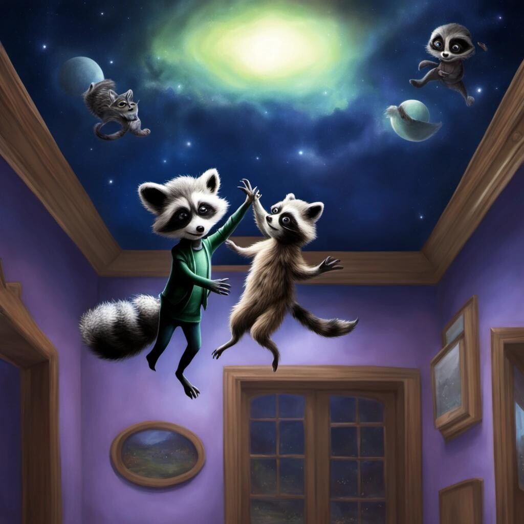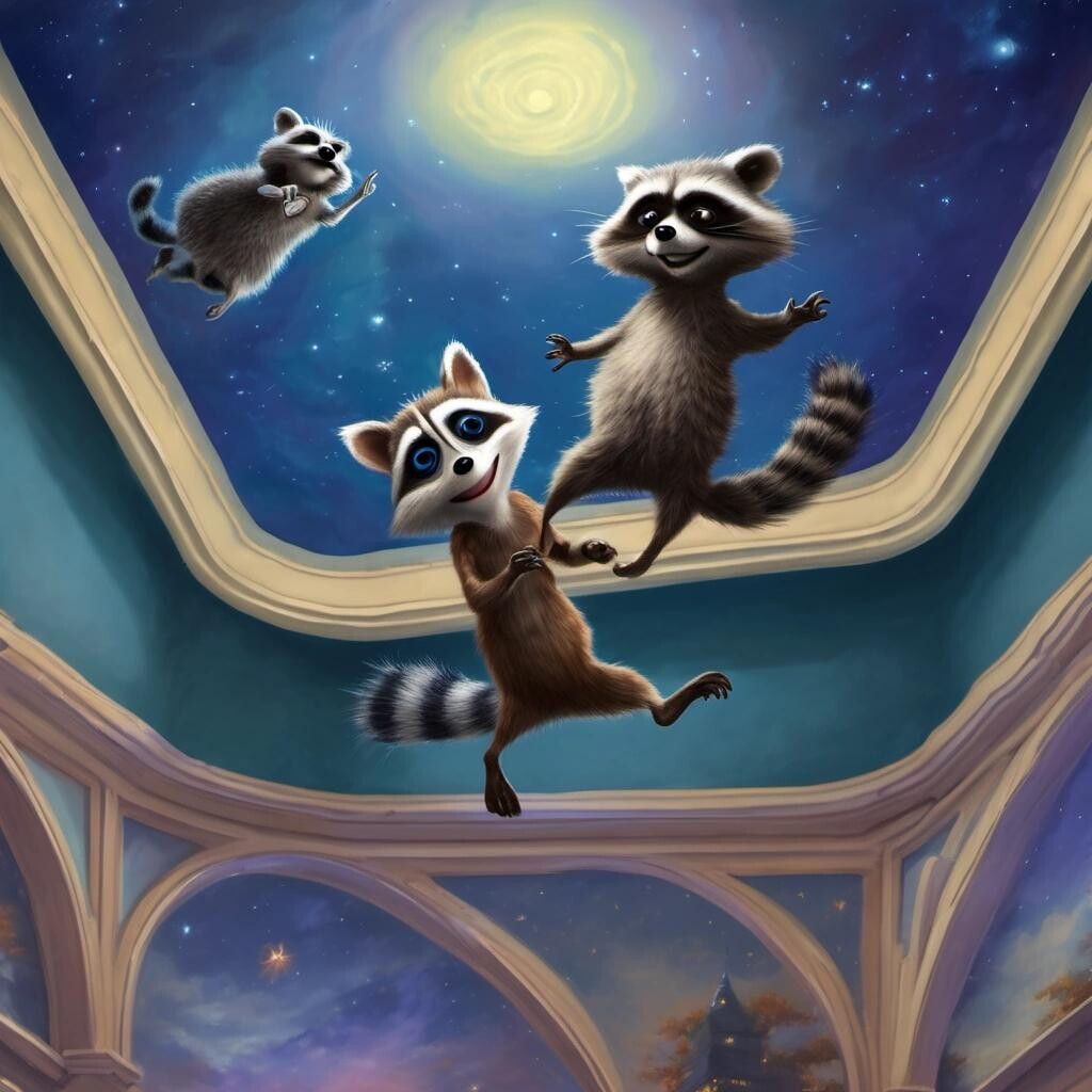 Prompt: an alien and a raccoon doing the waltz on the ceiling in the style of Thomas Kincade