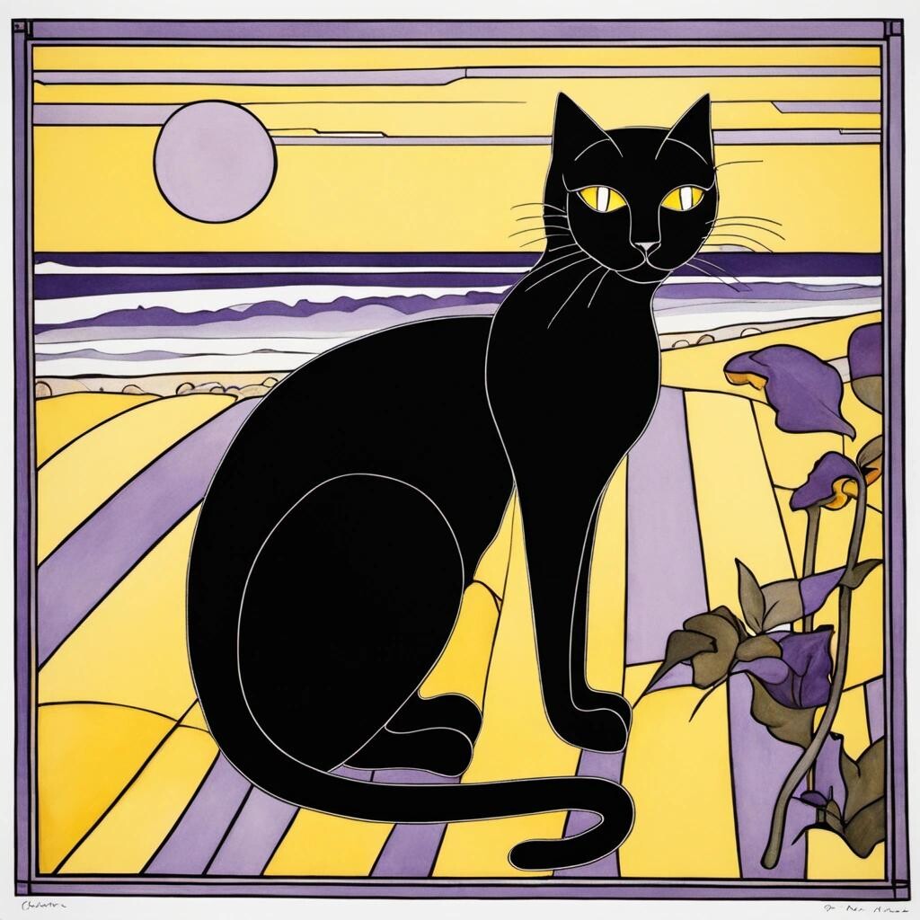 Prompt: nonbinary, black cat, at the beach, yellow, white, purple, black, art deco, Charles Rennie Mackintosh