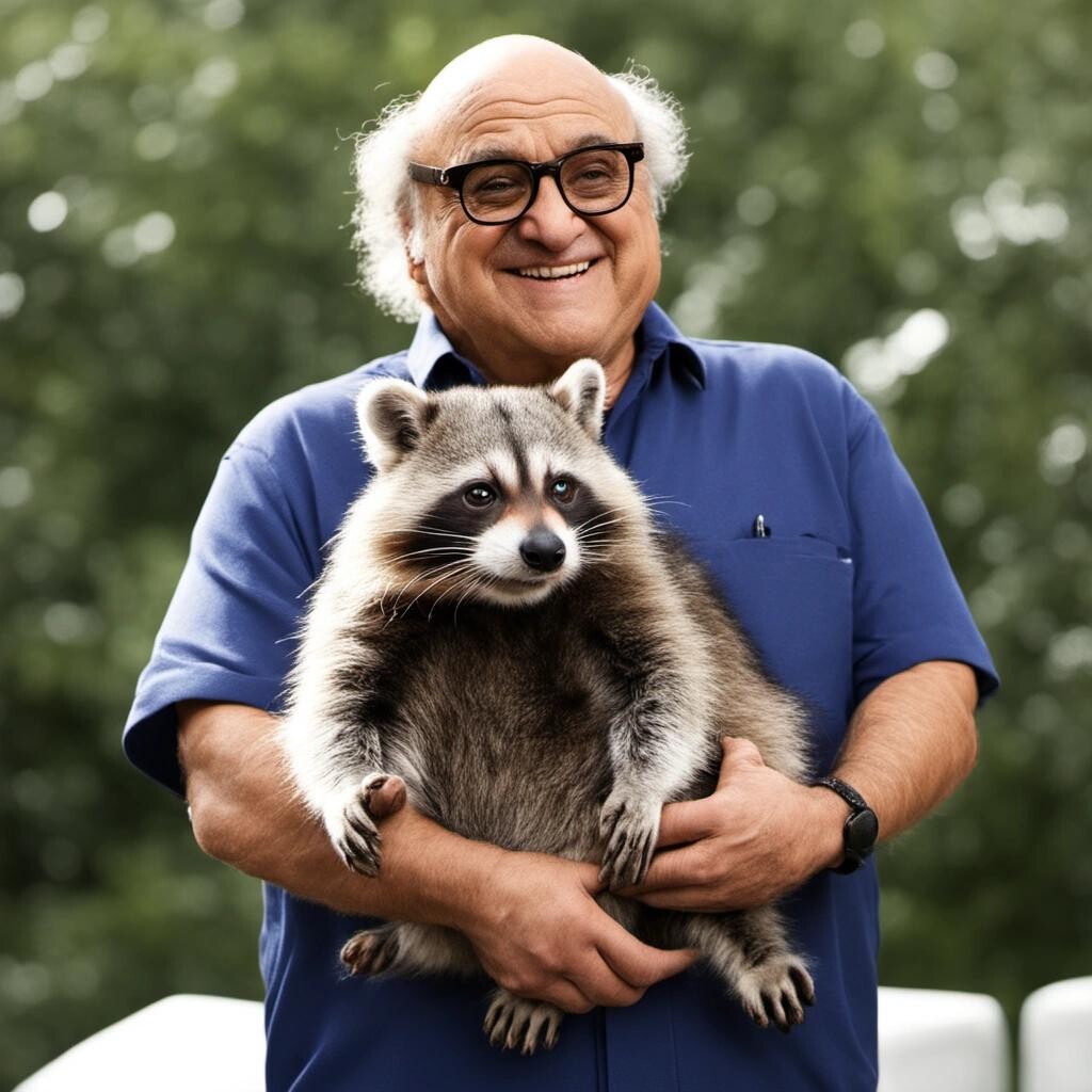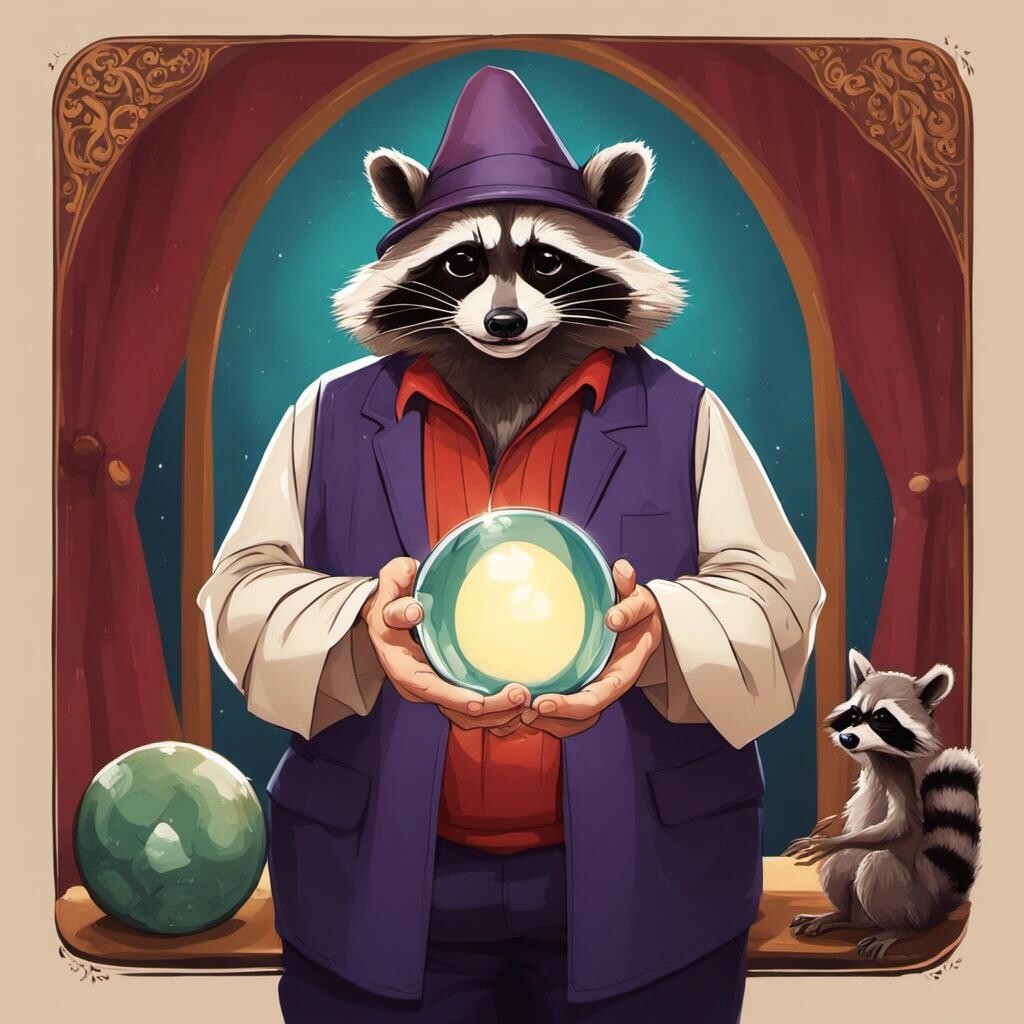 Prompt: Danny DeVito as a fortune teller with a crystal ball and with a pet raccoon