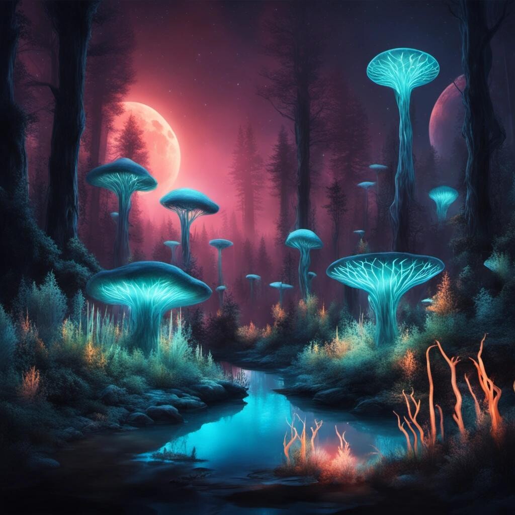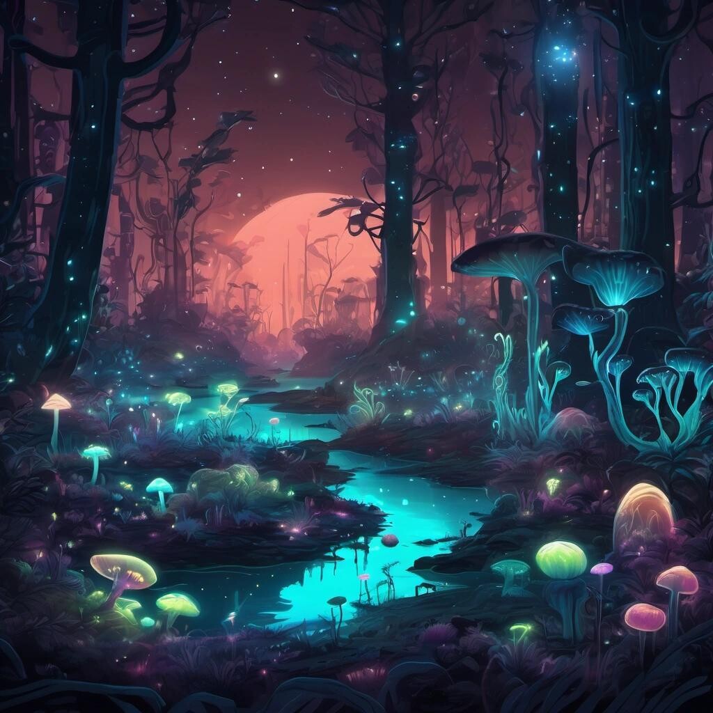 Prompt: a bioluminescent glowing forest on an alien world at night with strange plants and weird animals and other organisms