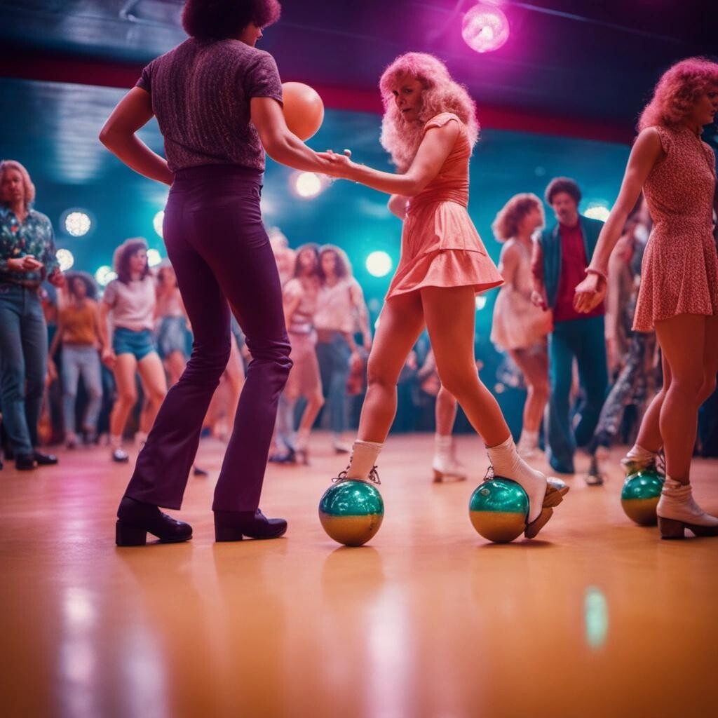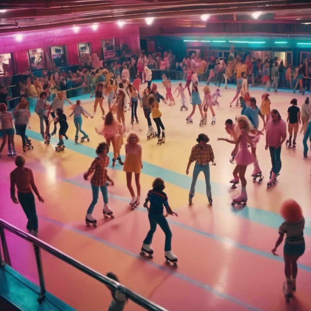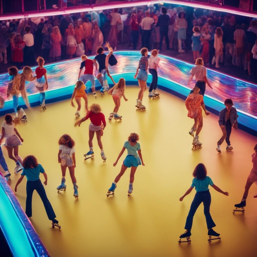 Prompt: dreamlike beautiful colorful, retro 1970s kodachrome, crowded, many people, hips swaying, curls bouncing, bubblegum popping at the roller disco rink, rollerskaters rollerskating, disco lighting, disco ball, cinematic, 4k