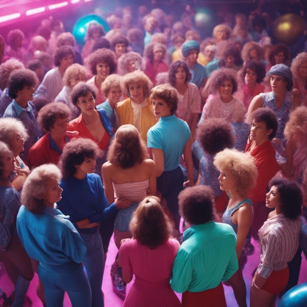 nostr:npub1p5qe4mtwxascahtp6szght2nlp06gwwwwllq7e7g6308p4y9dvys8nw2sf draw for me dreamlike beautiful colorful, retro 1980s kodachrome, crowded, many people, hips swaying, curls bouncing, bubblegum popping at the roller disco rink, rollerskaters rollerskating, disco lighting, disco ball, cinematic, 4k
