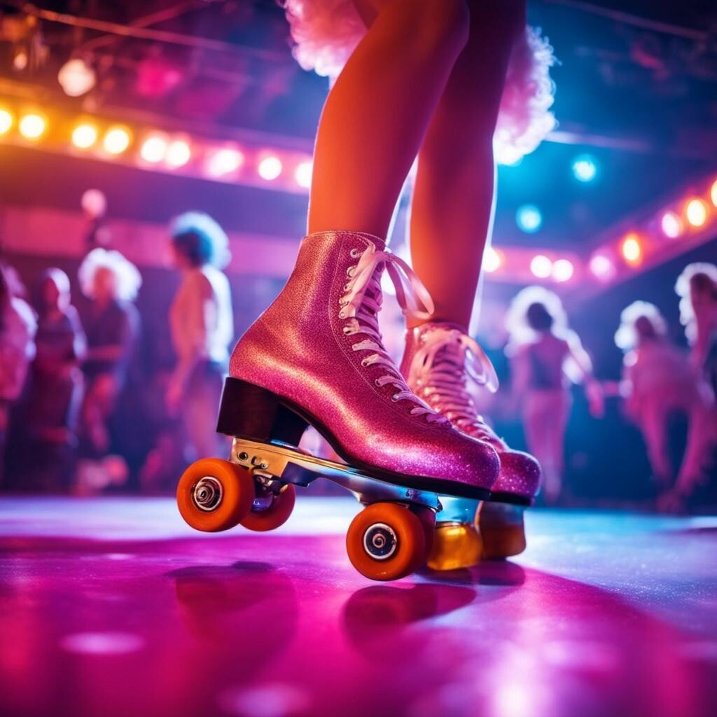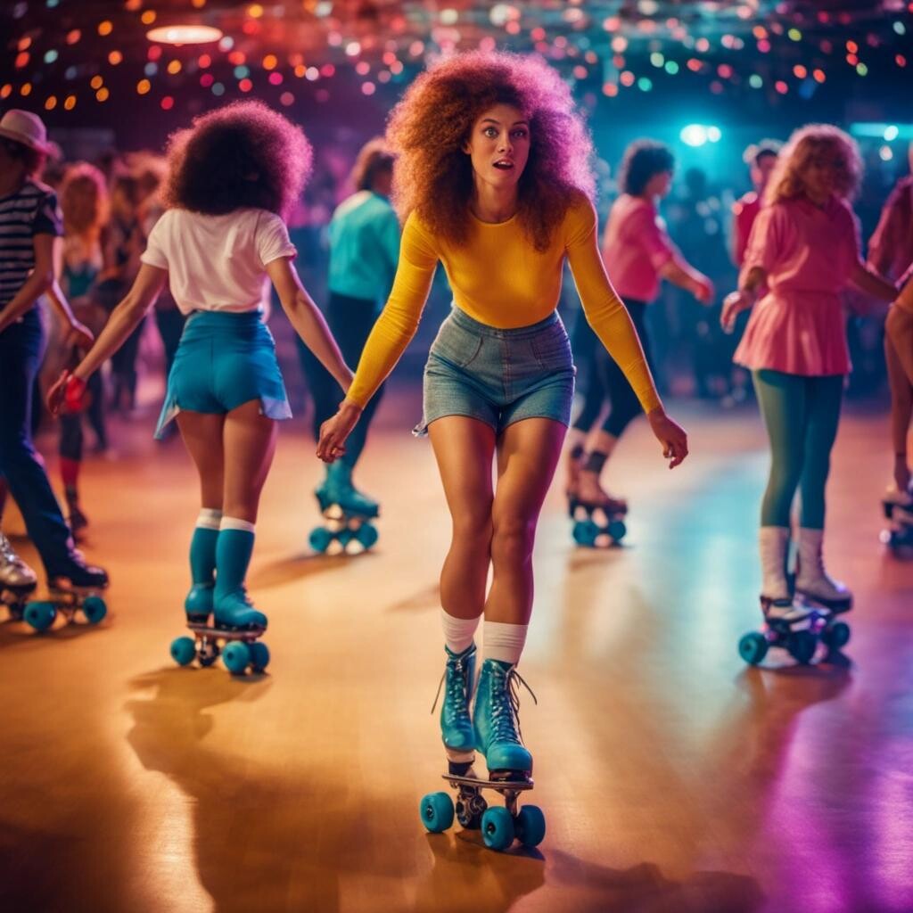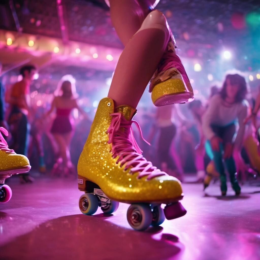 Prompt: cinematic 4k high angle extreme close shot, dreamlike glittery beautiful colorful, retro 1980s kodachrome, crowded, many people rollerskating around the rink, her hips swaying, curls bouncing, bubblegum popping at the roller disco rink, disco ball hanging from the ceiling, rollerskaters rollerskating