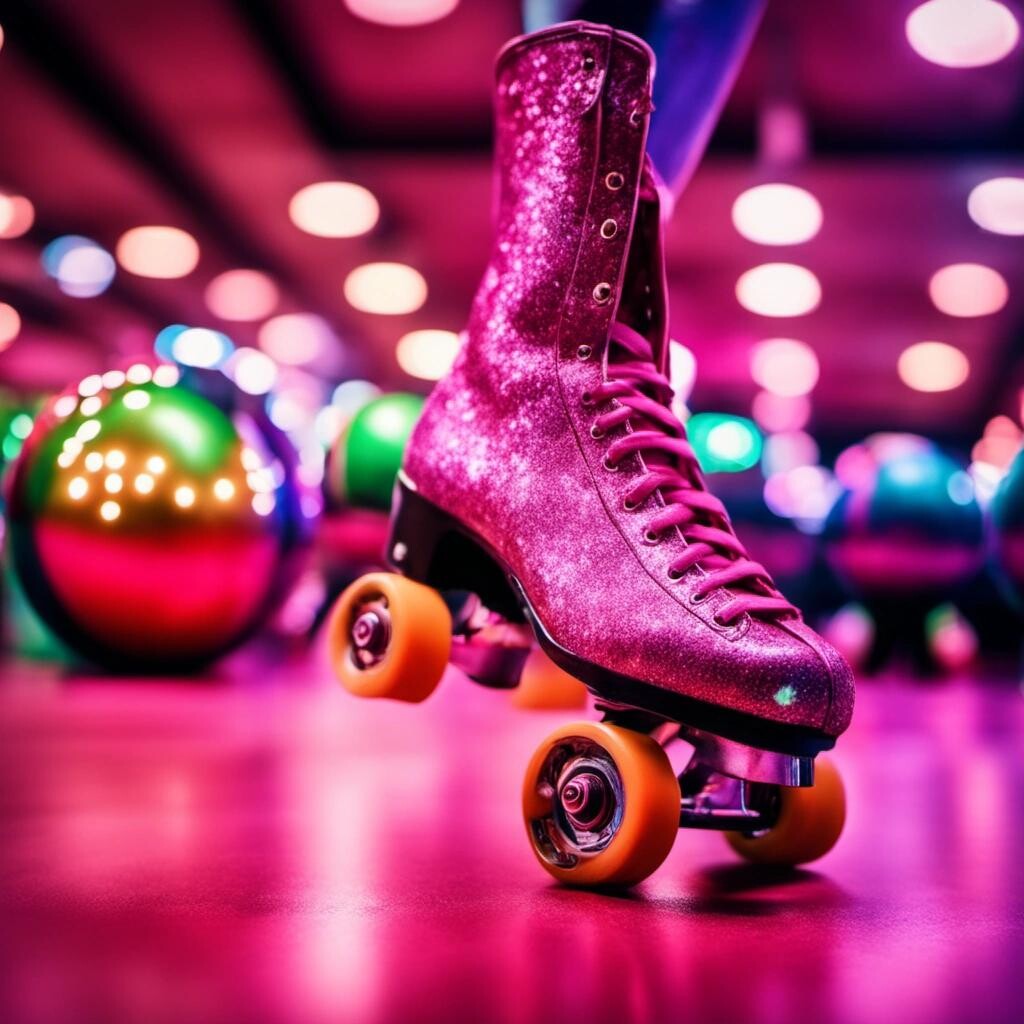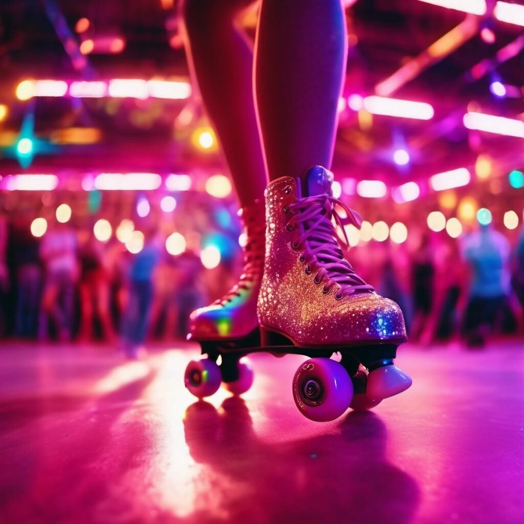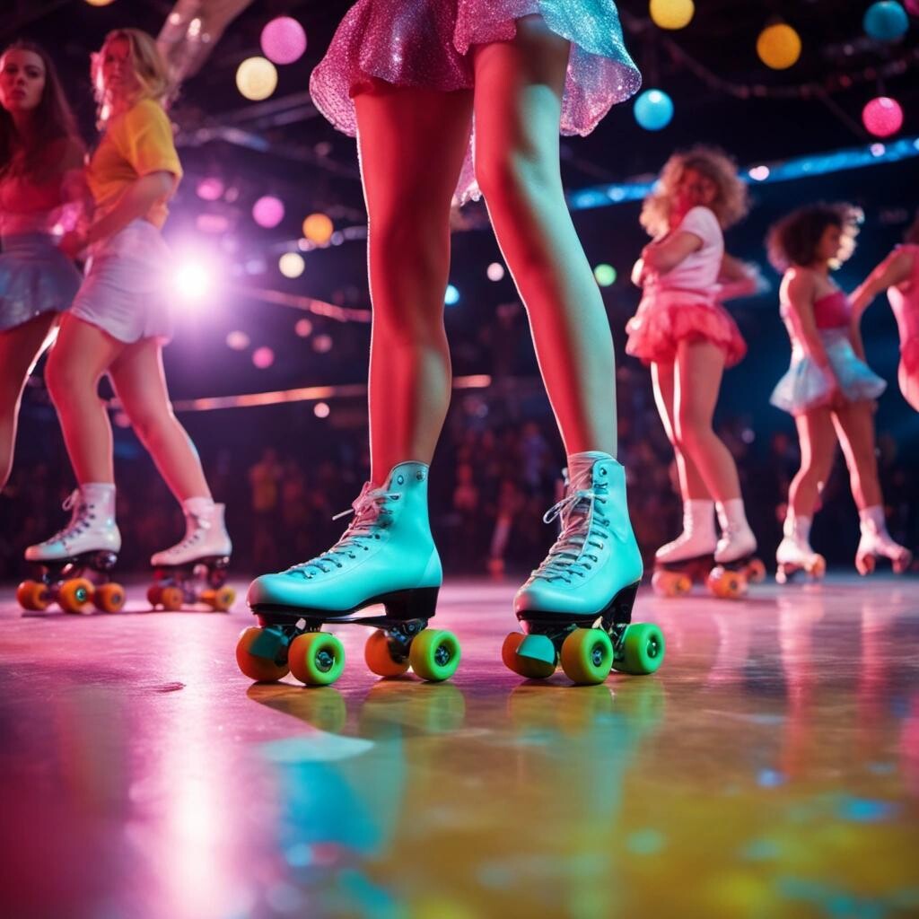 Prompt: cinematic 4k high angle extreme close shot, dreamlike glittery beautiful colorful, retro 1980s kodachrome, crowded, many people rollerskating around the rink, her hips swaying, curls bouncing, bubblegum popping at the roller disco rink, disco ball hanging from the ceiling, rollerskaters rollerskating