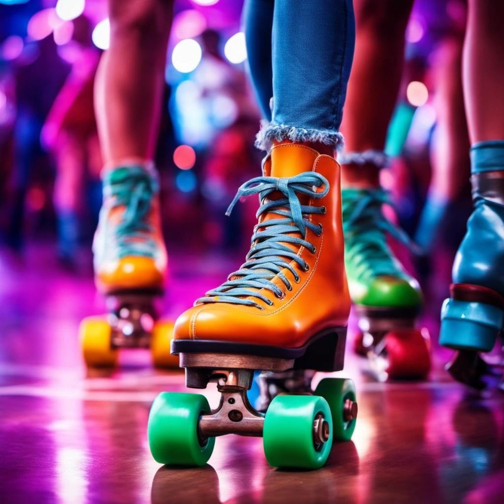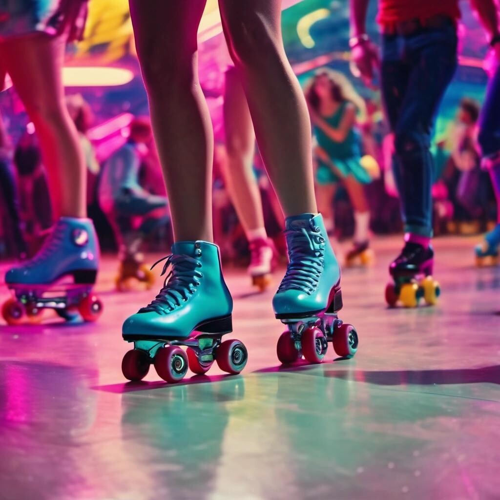 Prompt: cinematic 4k high angle extreme close shot, dreamlike beautiful colorful, retro 1980s kodachrome, crowded, many people rollerskating around the rink, her hips swaying, curls bouncing, bubblegum popping at the roller disco rink, rollerskaters rollerskating
