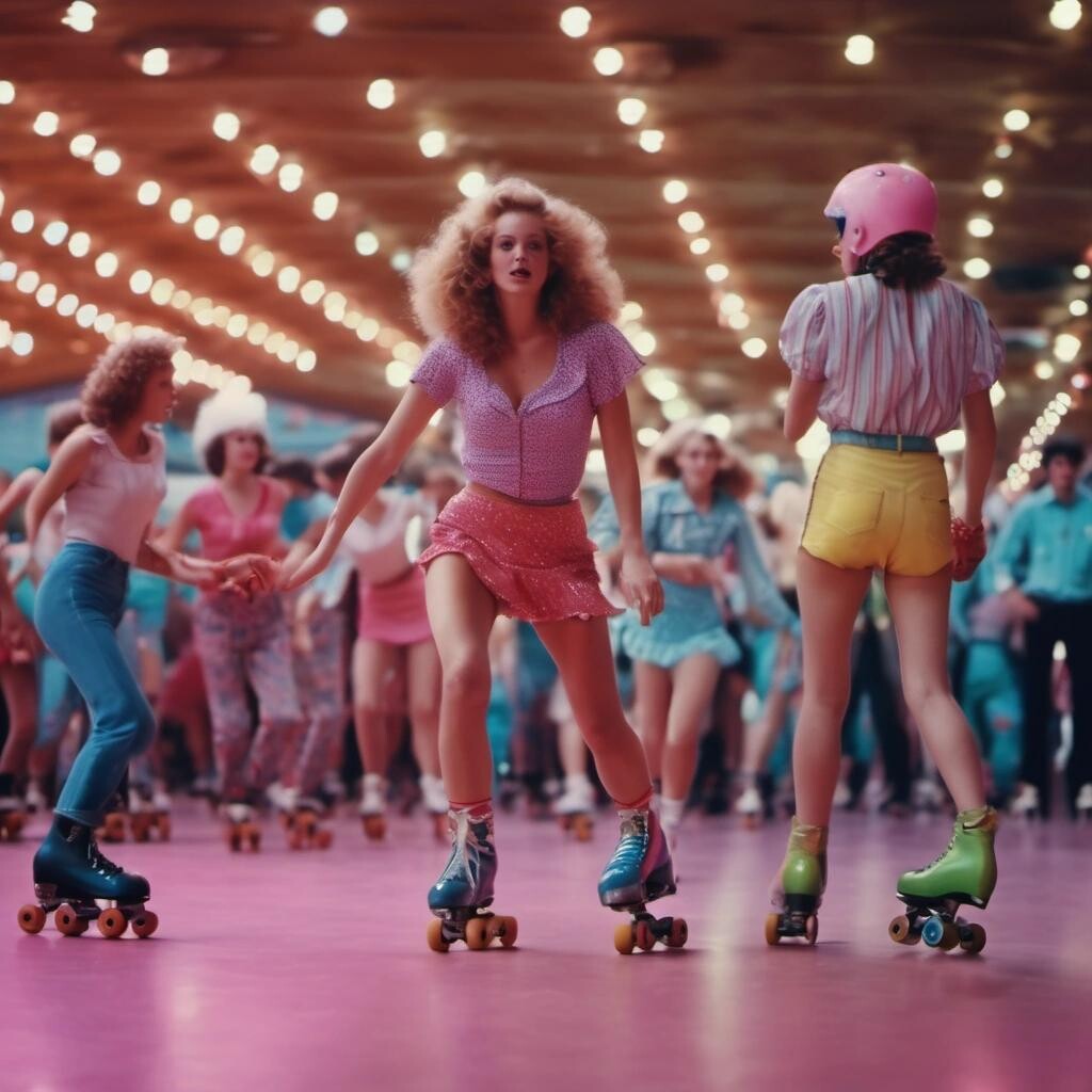 Prompt: dreamlike beautiful colorful, retro 1980s kodachrome, crowded, many people, hips swaying, curls bouncing, bubblegum popping at the roller disco rink, rollerskaters rollerskating, disco lighting, disco ball, cinematic, 4k