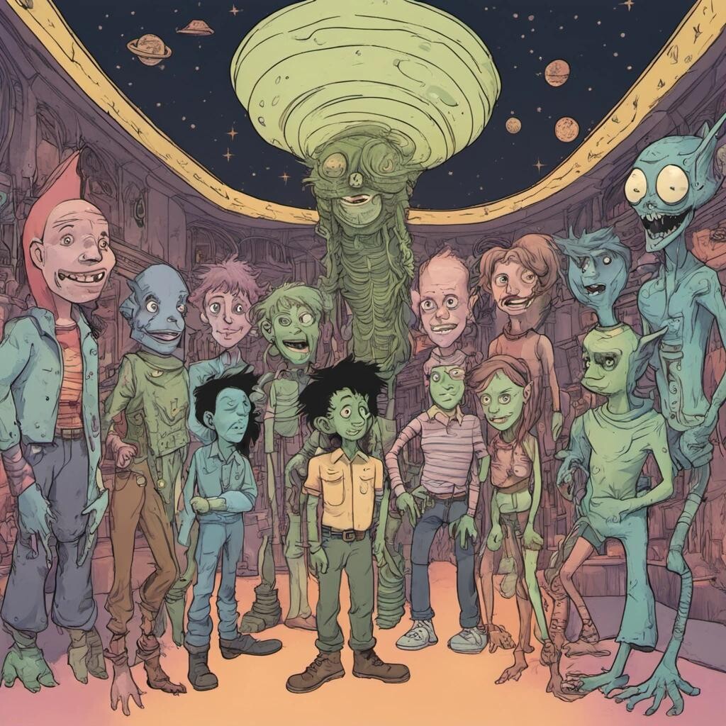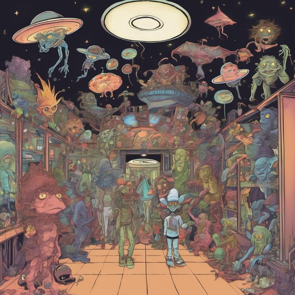 Prompt: an trans-dimensional hotel lobby crowded with aliens and monsters and pixies and trolls and goblins and space cowboys and ice pirates and Kurt Vonnegut category: dreambooth