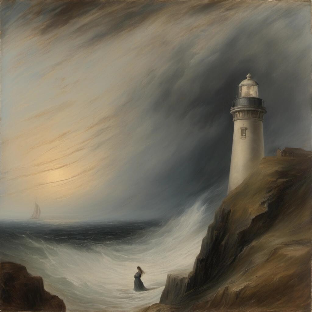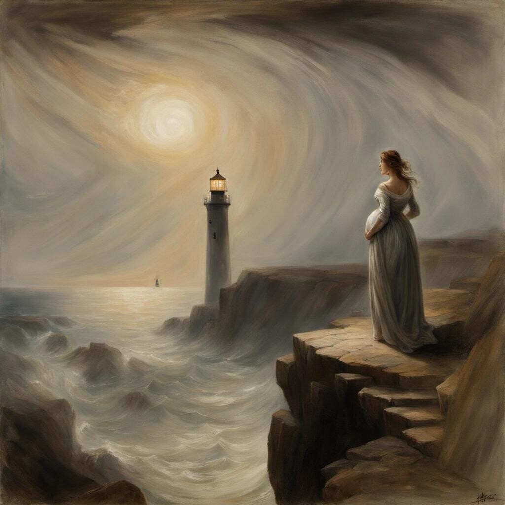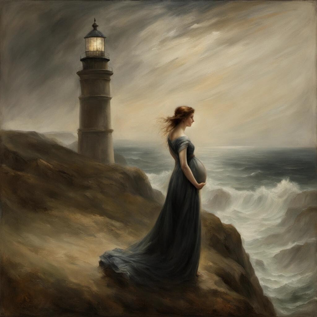 Prompt: long shot over the shoulder of a pregnant woman standing on the cliffs overlooking the ocean, hair blowing in the wind, somber dark color palette, oil painting by JMW Turner, highly detailed, lighthouse far in the distance in the background