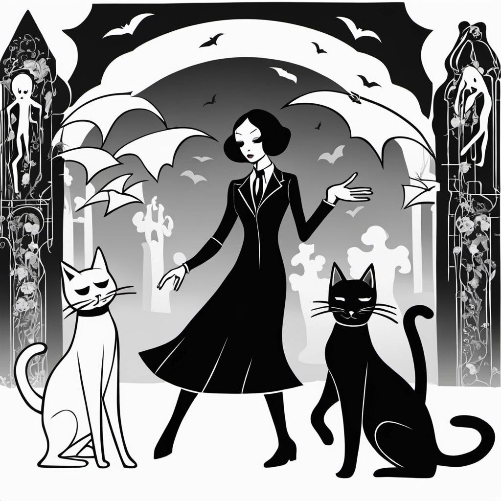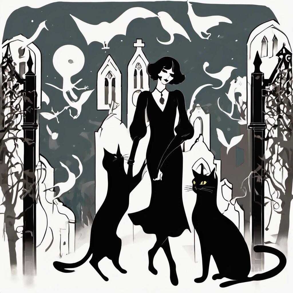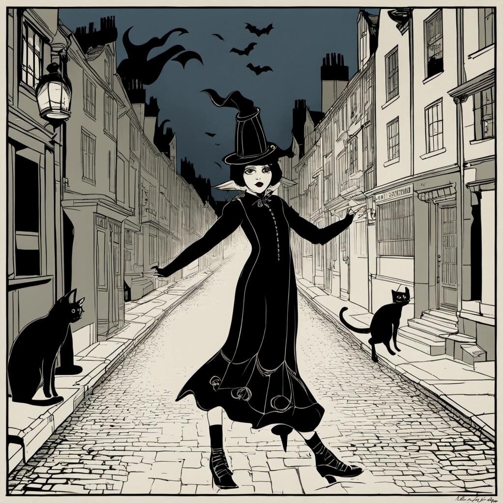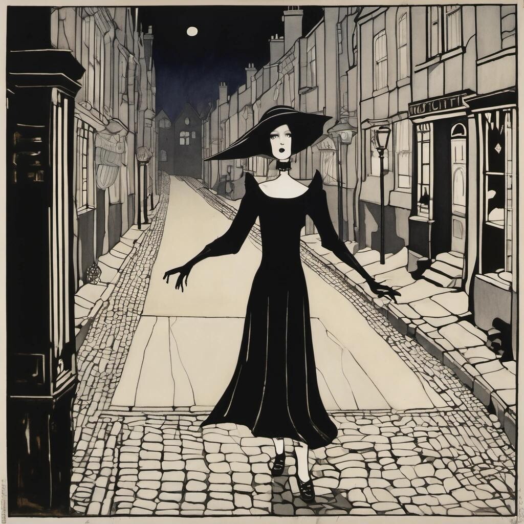 Prompt: a dancing goth girl in a 1890 street, ghosts, halloween, black cats, art deco, Charles Rennie Mackintosh