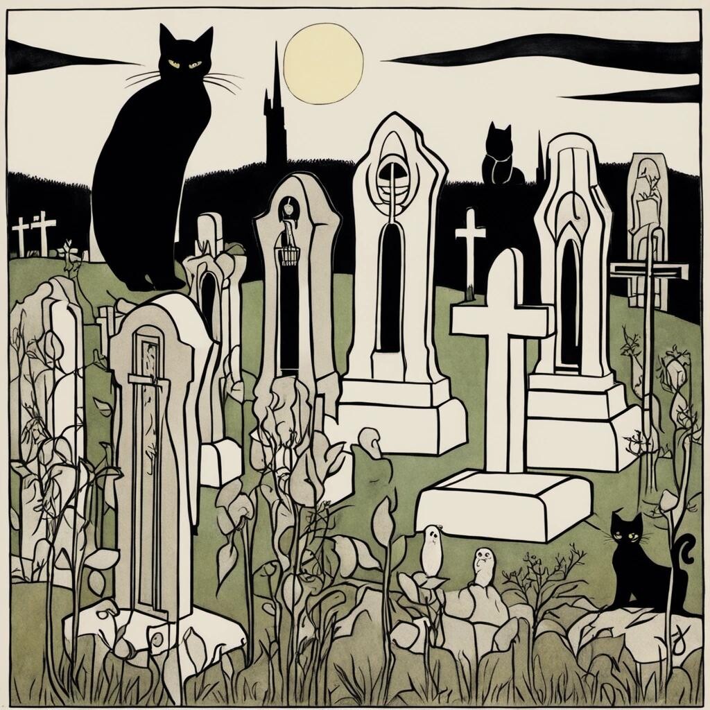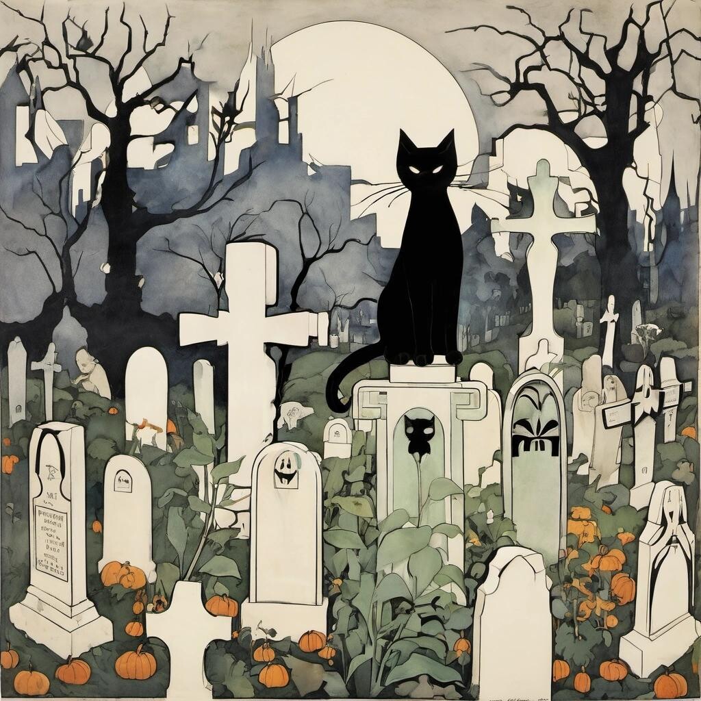 Prompt: an old graveyard with ghosts, black cats, halloween, plants, art deco, Charles Rennie Mackintosh