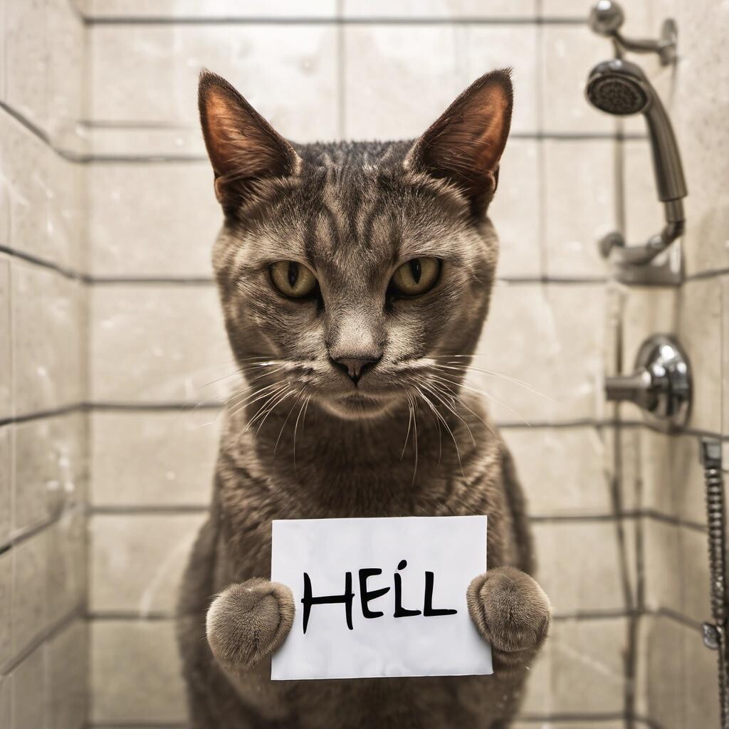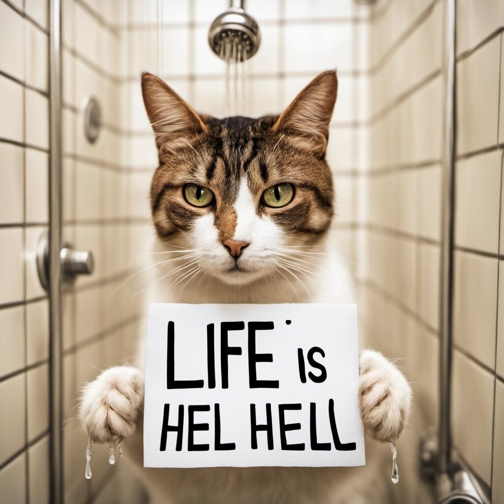 Prompt: a cat under the shower, looking annoyed and holding a sign which says "Life is hell"