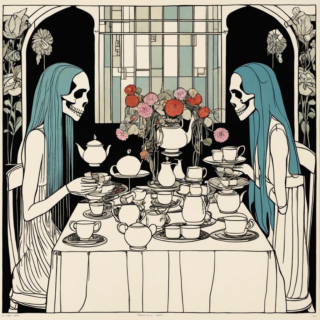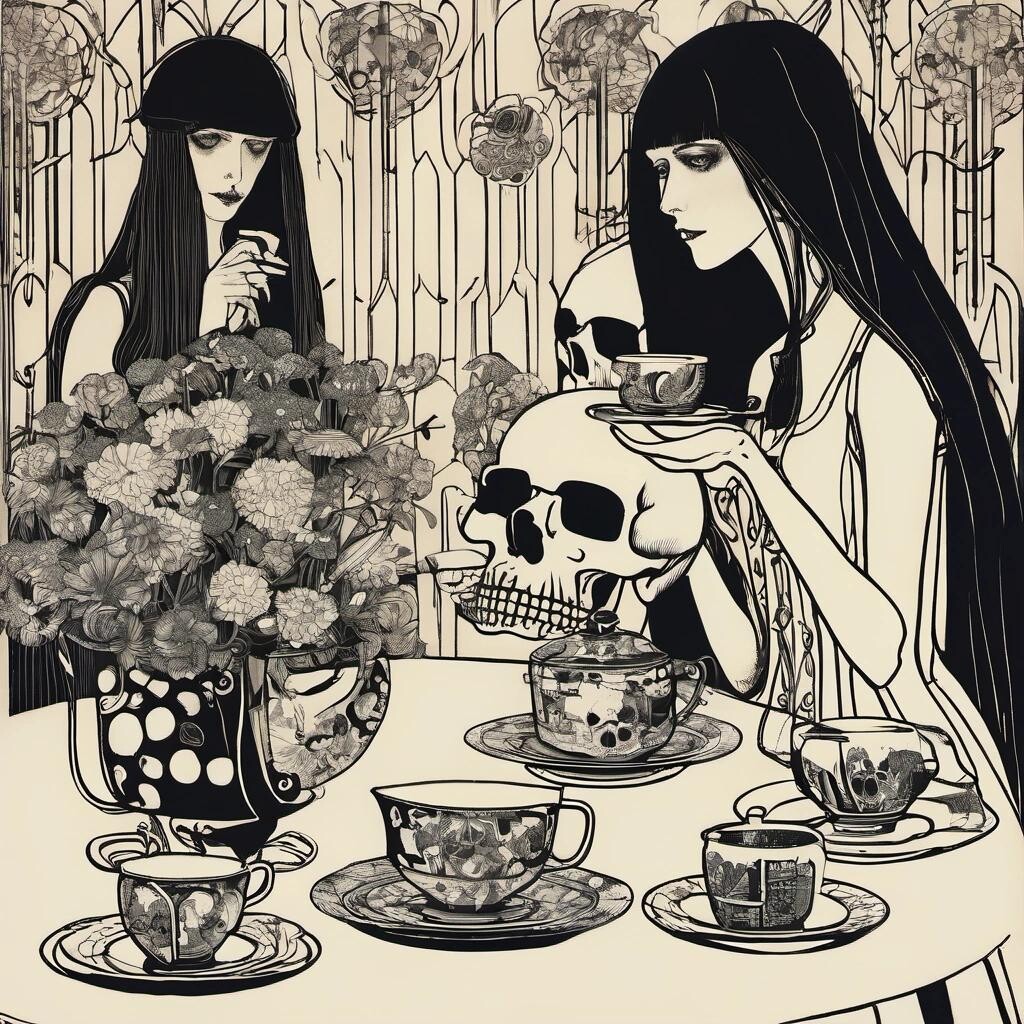 Prompt: a gothic tea party, skull shaped flowers, long haired girls, eery, art deco, Charles Rennie Mackintosh