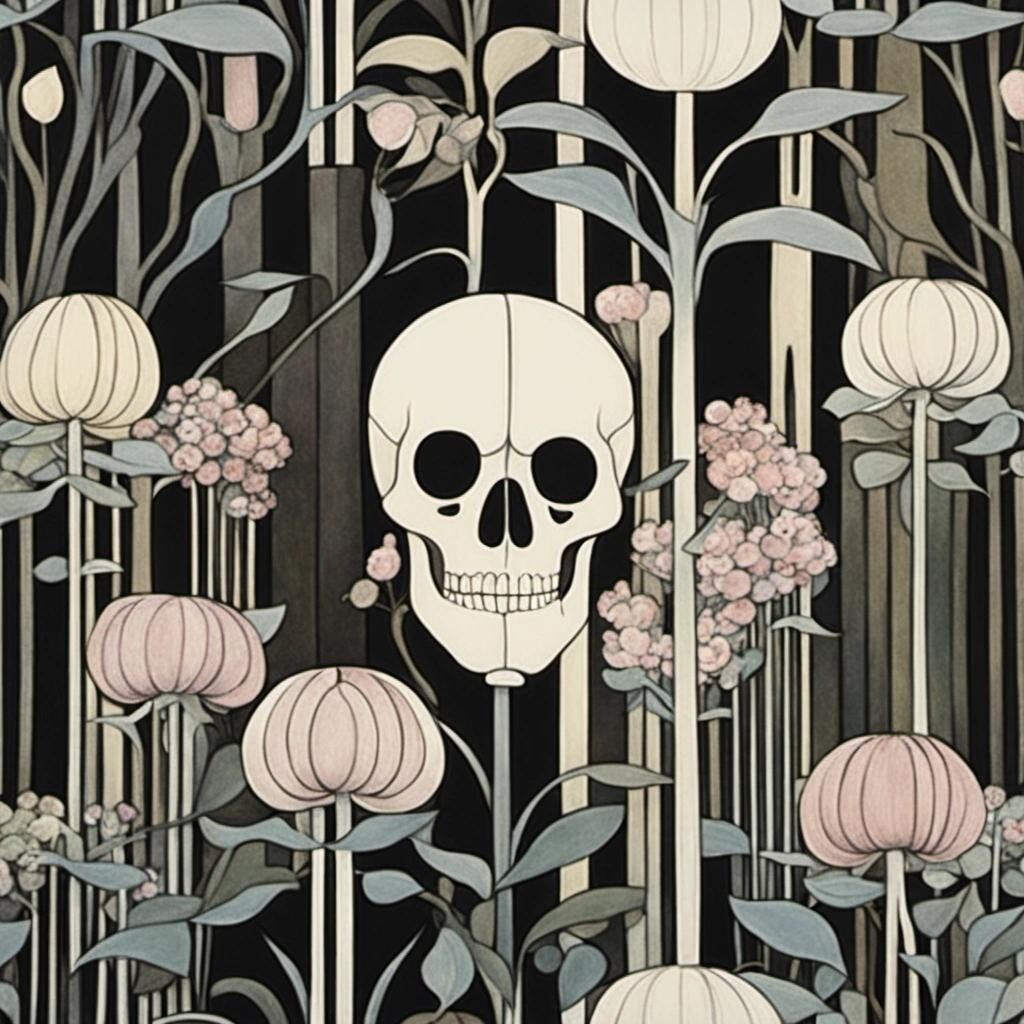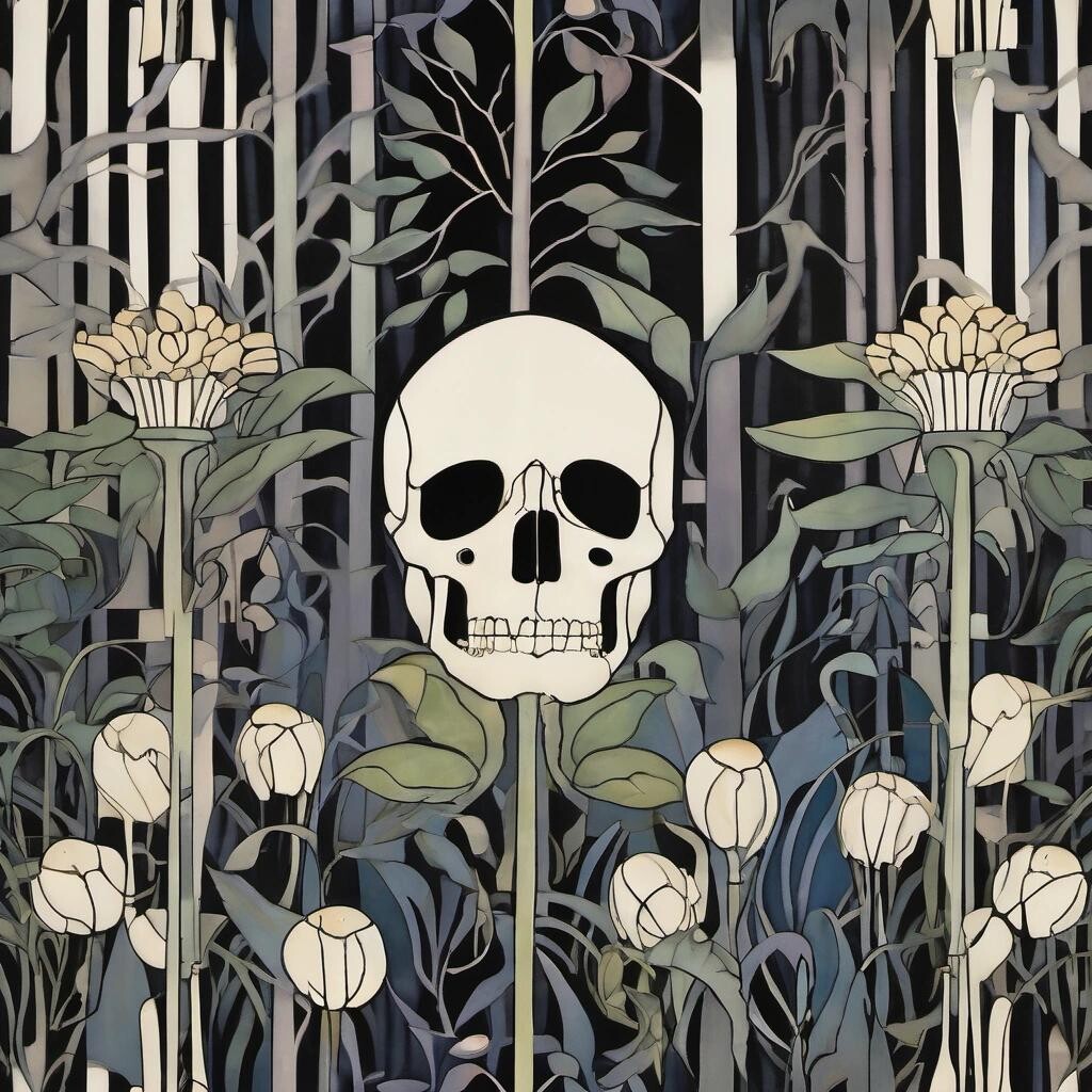 Prompt: skull shaped flowers in a dark forest, eery, art deco, Charles Rennie Mackintosh
