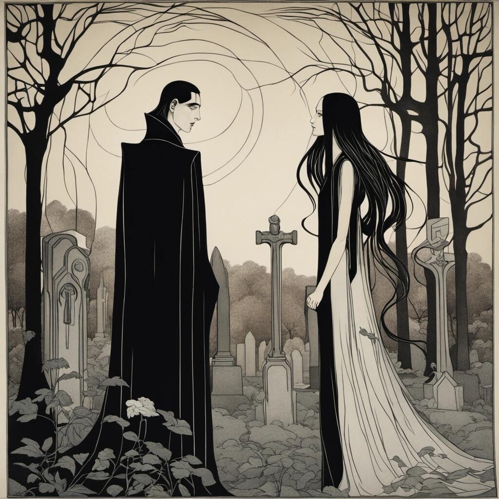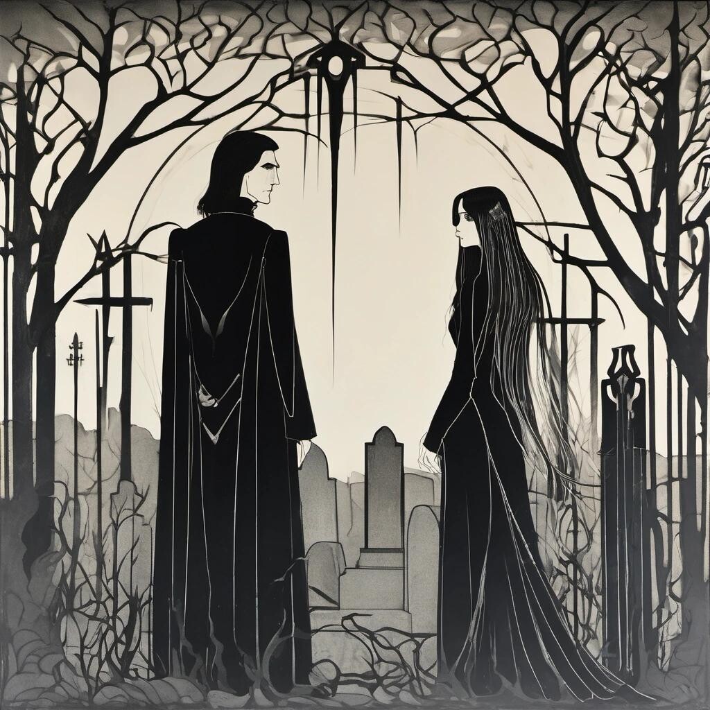 Prompt: a gothic couple with very long hair at an old graveyard surrounded by eery trees, art deco, Charles Rennie Mackintosh