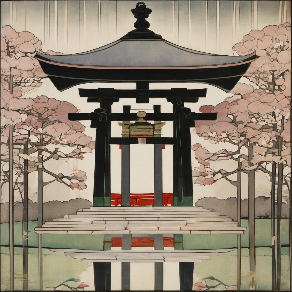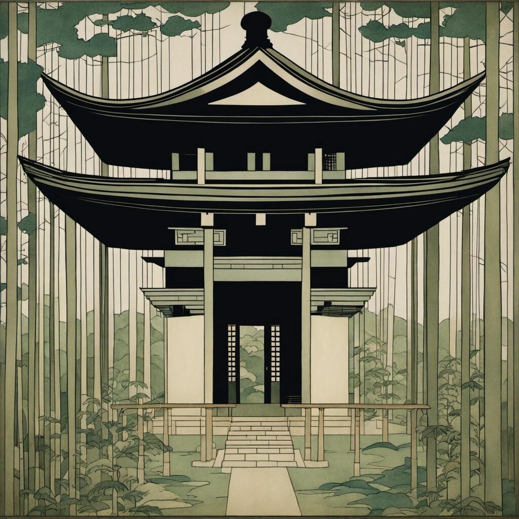 Prompt: a japanese shrine surrounded by trees, art deco, Charles Rennie Mackintosh