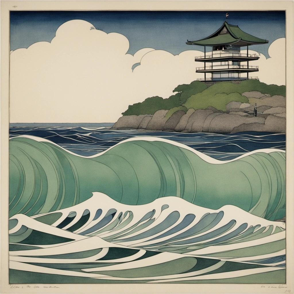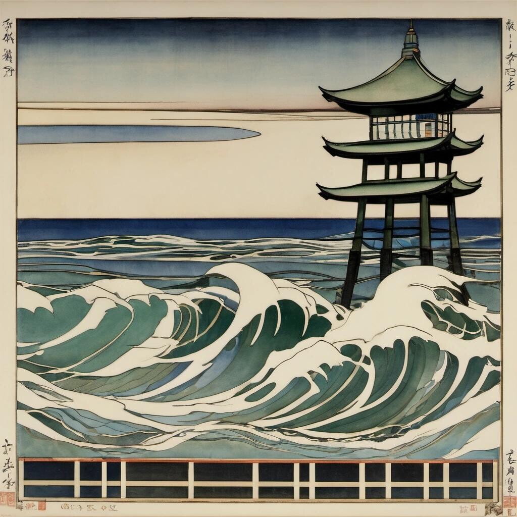 Prompt: a japanese tori at the sea, waves, art deco, Charles Rennie Mackintosh