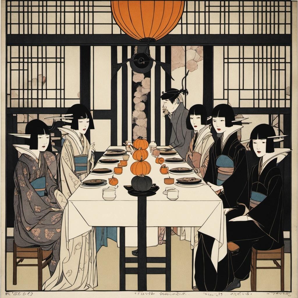 Prompt: a japanese halloween party in 2023, art deco, Charles Rennie Mackintosh