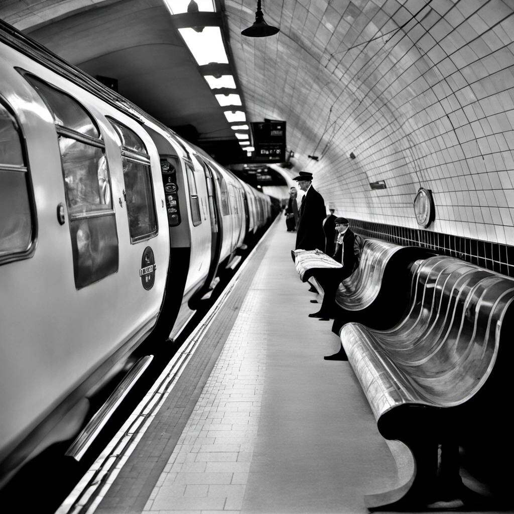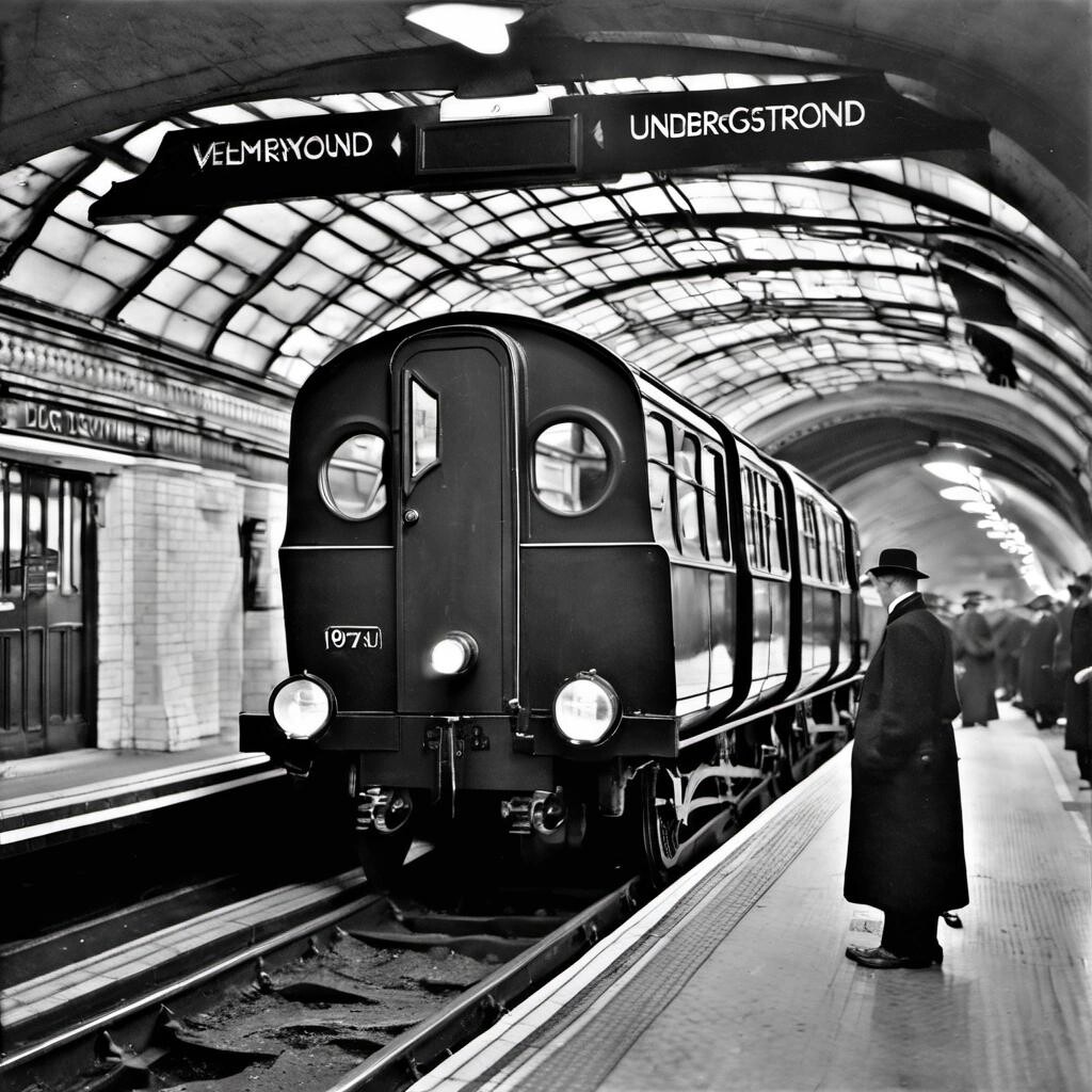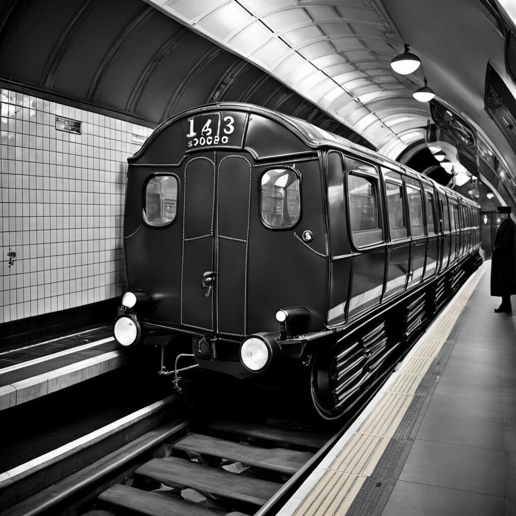 Prompt: London Underground 1938 rolling stock at station:sdxl-photo