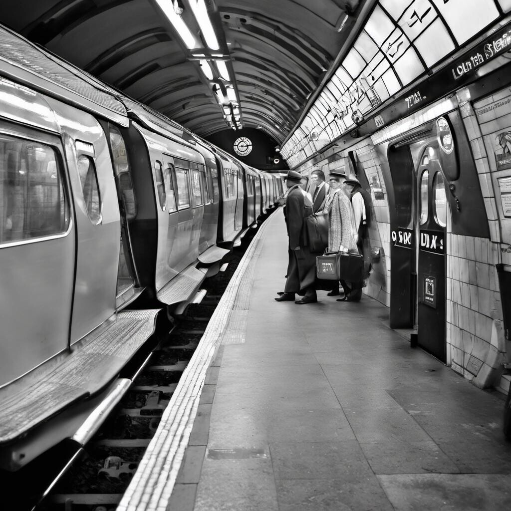 Prompt: London Underground 1938 rolling stock at station