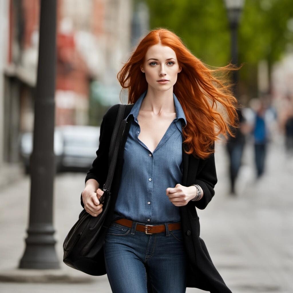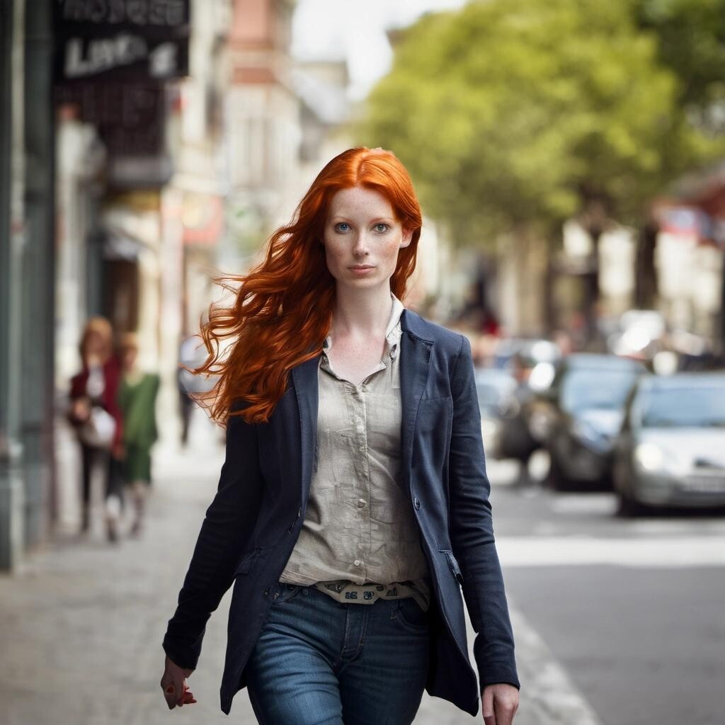 Prompt: redhead woman walking down street:sdxl-photo