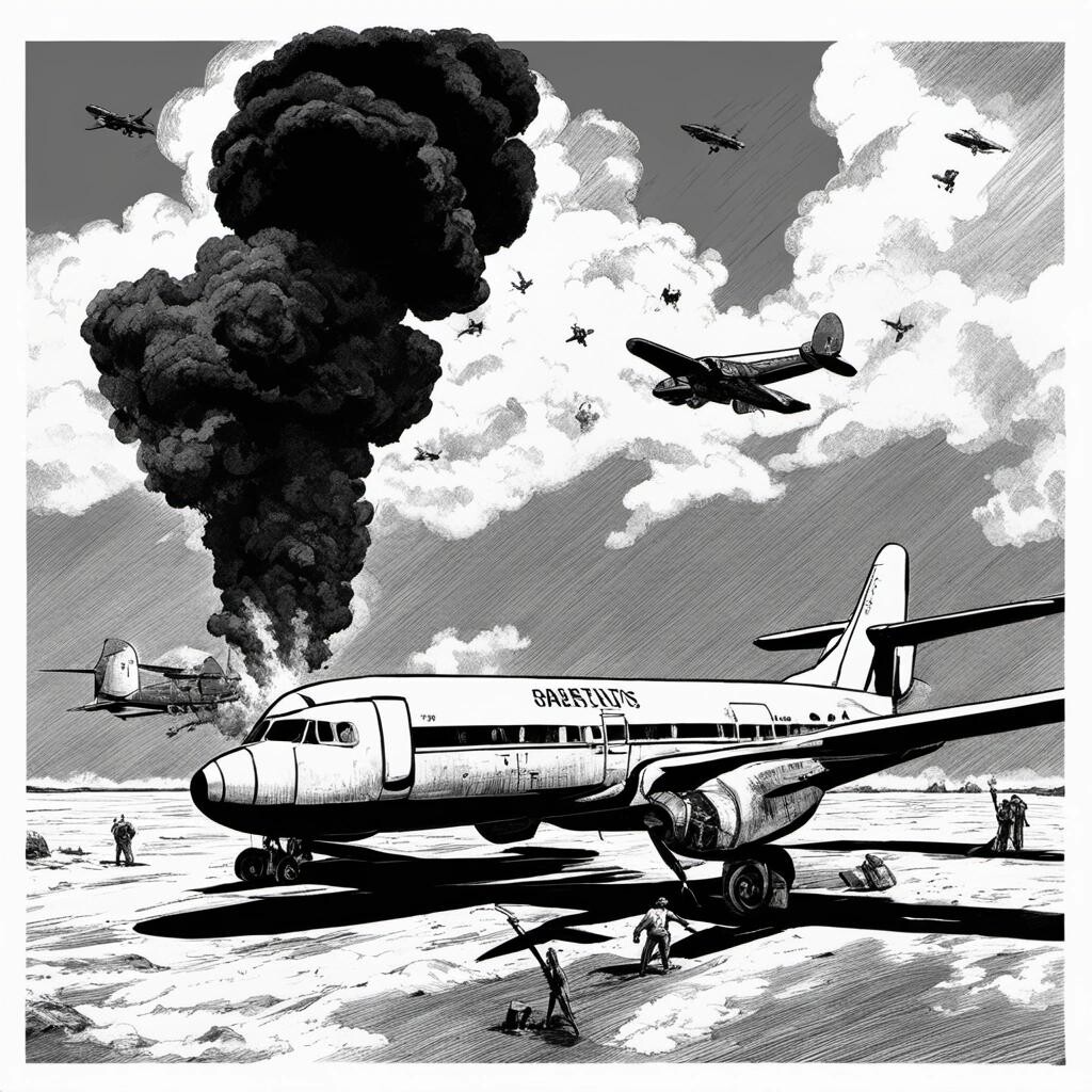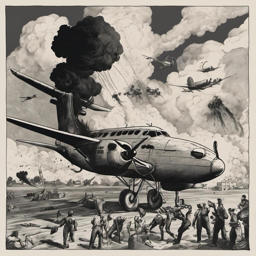 Prompt: The Langoliers. A black cloud consumes the back end of a plane while a small group of survivors try to take control of the cock pit